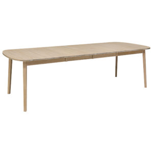 Matbord Rainbow från Hans K, ett nätt matbord med rundade kanter och svarvade ben. Bordet har måtten 162×100 cm, det ingår två iläggsskivor på 48 cm – maxlängd på bordet med illägg blir 258 cm. Här i massiv blondbetsad ask.