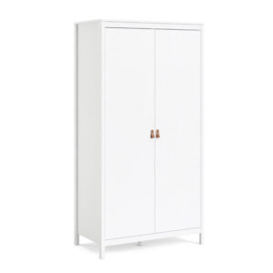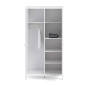 Stilren garderob med 2 dörrar i vitt. I garderoben finns mycket förvaring i form av 1 klädstång, 2 fasta och 3 flyttbara hyllplan. Medföljer två varianter på handtag – välj det som passar dig bäst, bruna i läder eller knoppar i plast. Levereras omonterad.