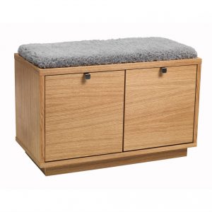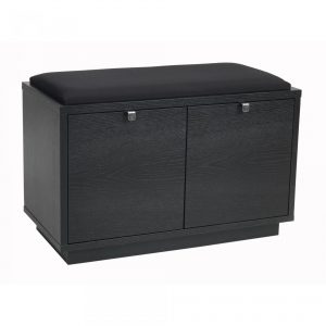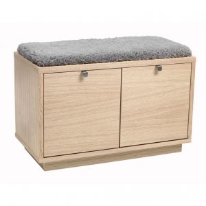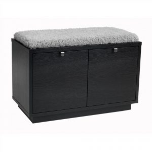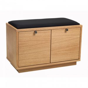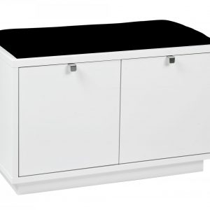 Confetti sittbänk i massiv ek (vitlack i massiv björk). Praktisk och stilren sittbänk med två rymliga lådor som tar hand om förvaringen. Snygga beslag i metall. Välj dyna i svart tyg eller fårskinnslook.