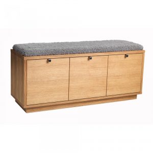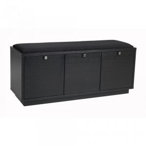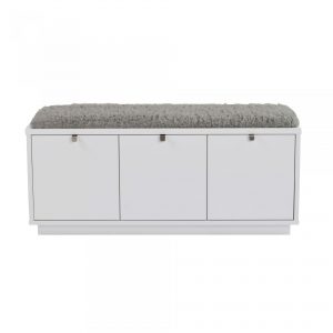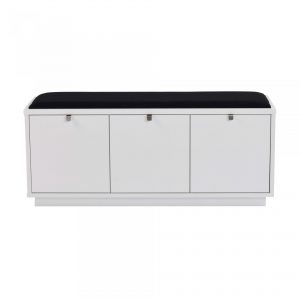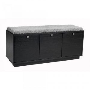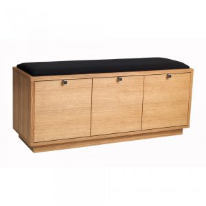 Confetti sittbänk i massiv ek (vitlack i massiv björk). Praktisk och stilren sittbänk med tre rymliga lådor som tar hand om förvaringen. Snygga beslag i metall. Välj dyna i svart tyg eller fårskinnslook.