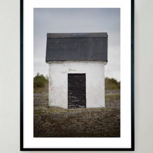 Fotografi av ett ensamt, vitt stenhus. På Fårö, Gotland. Motivet har en inbyggd passepartout i vitt.