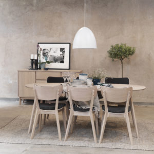 Stolen Kato i vitpigmenterad ek och stoppad sits med mörkgrått tyg. Stilren och stabil stol som passar lika bra till matbordet som för sig själv.