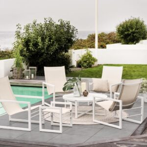 Vevi är en läcker fåtölj i vit aluminium/textilene. Lika läcker att placera för sig själv som i grupp runt t ex soffbordet i samma serie.