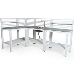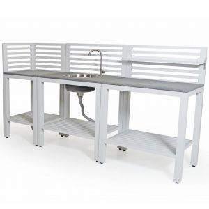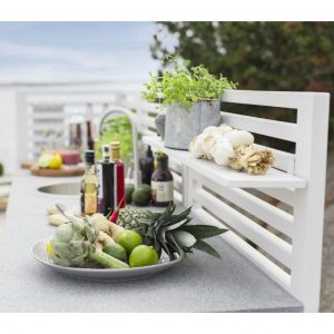 Bellac utekök i mattlackerad aluminium, med grå stenskiva och flyttbar hylla. Uteköket har även en praktisk underhylla och ställbara tassar. Komplettera med uteköksdel med vask eller hörndel. Från Brafab.