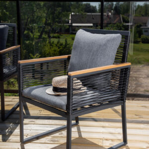 Loungegrupp Dallas är ett modernt stilrent set till uteplatsen eller altanen. Gruppen består av en tvåsitssoffa och två karmstolar inklusive grå dynor samt ett soffbord med en bordsskiva i glas. Tillverkad i svart pulverlackerad metall och svart rep samt fina detaljer i trä. Levereras omonterad.
