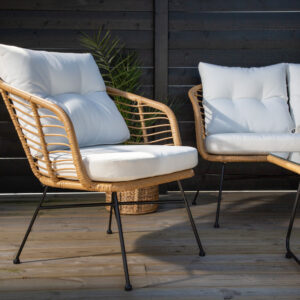 Loungegrupp Viga är en stilren nätt soffgrupp i modern design som passar perfekt på den inglasade uteplatsen. Gruppen består av en tvåsitssoffa, två fåtöljer tillverkat i en nätt ramställning i svart pulverlackerad metall samt rygg och sits är designat i ett stilrent nätt mönster av naturfärgad konstrotting. Inklusive vita dynor och ett soffbord med detaljer i konstrotting och en bordsskiva av glas.