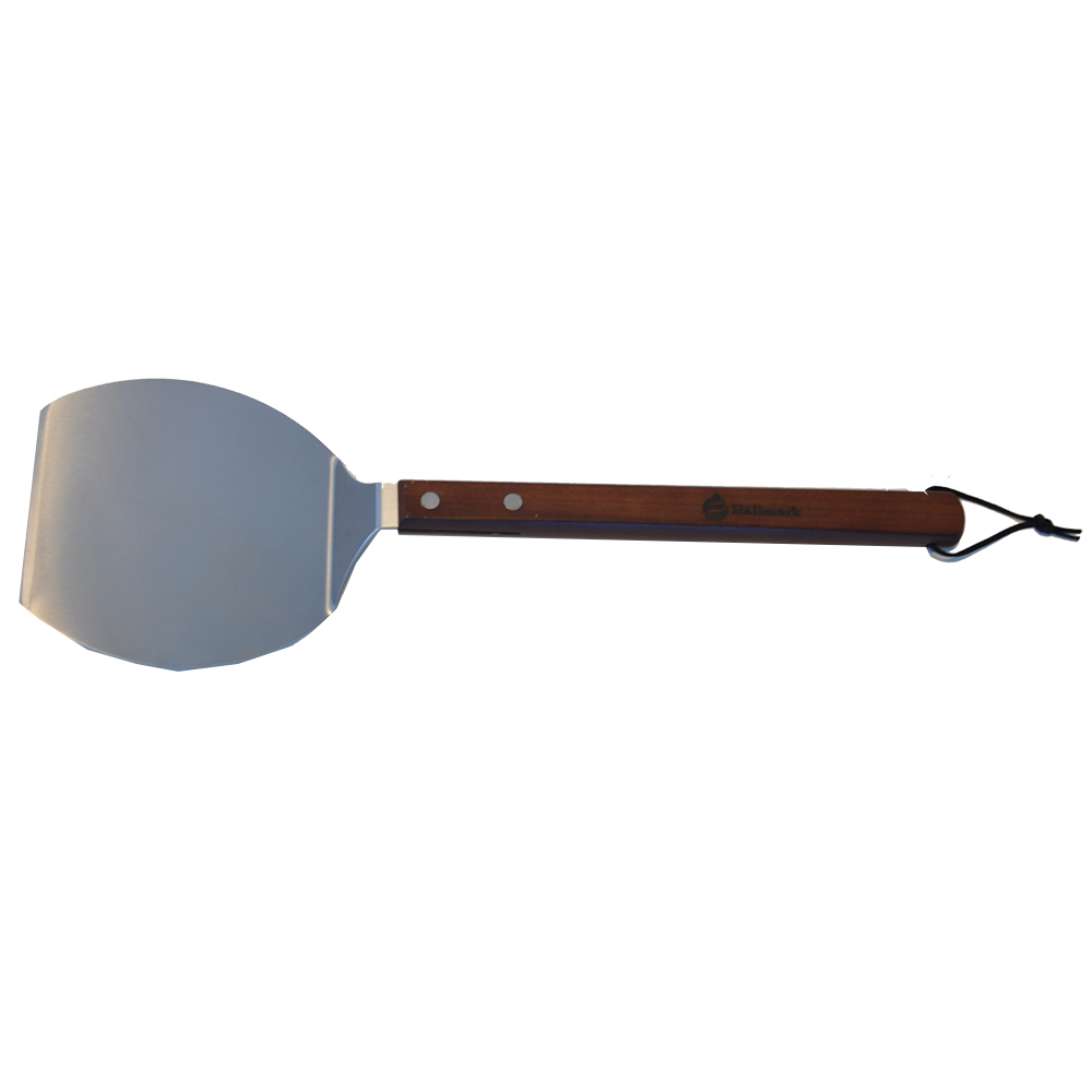 En robust och bred grillspatel, perfekt för användning vid tillagning av bland annat hamburgare. Har en fasad bred kant som gör det lättare att få upp burgarna på spateln. Tillverkad i rostfritt stål och har ett kraftigt trähandtag.