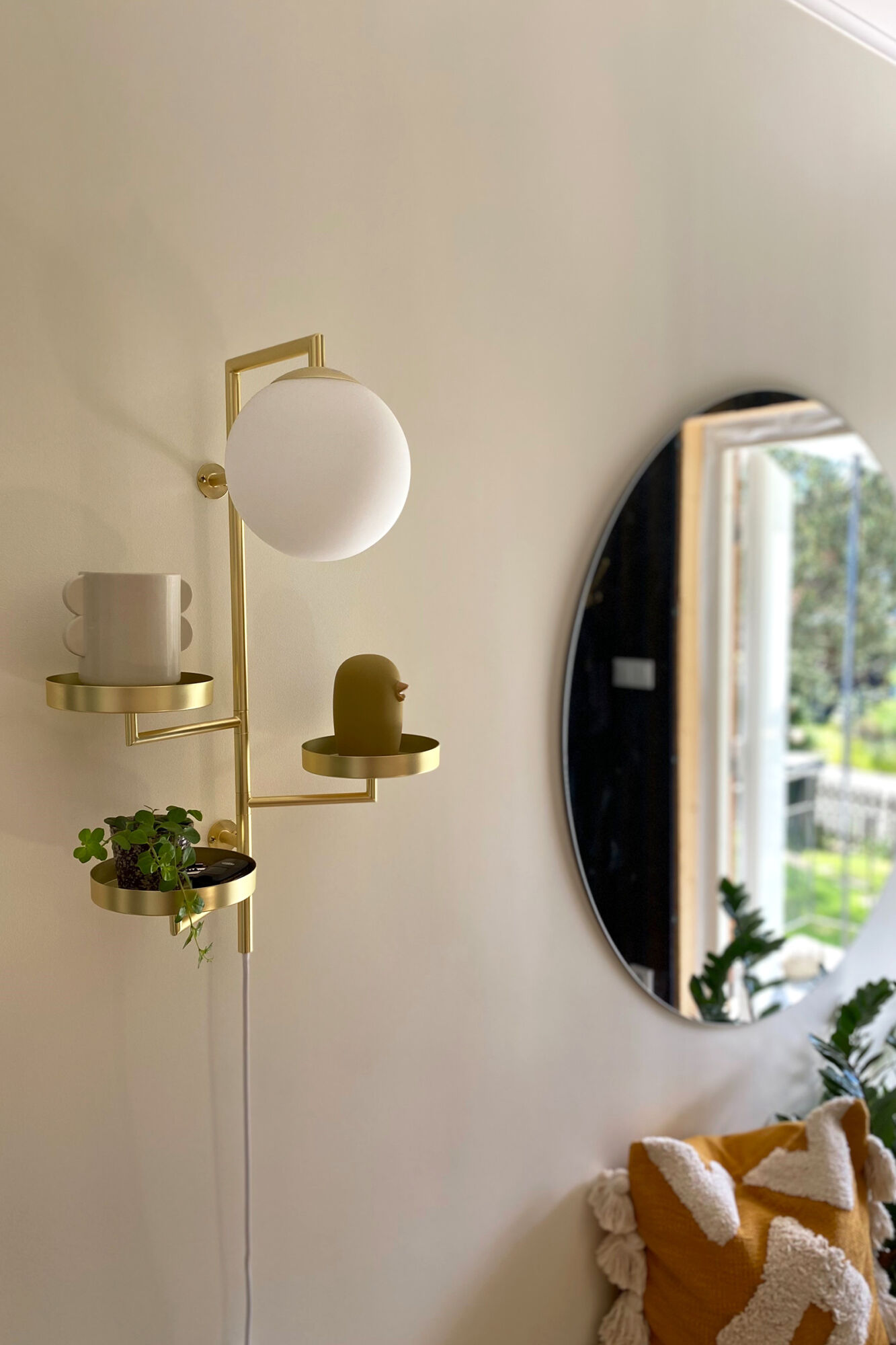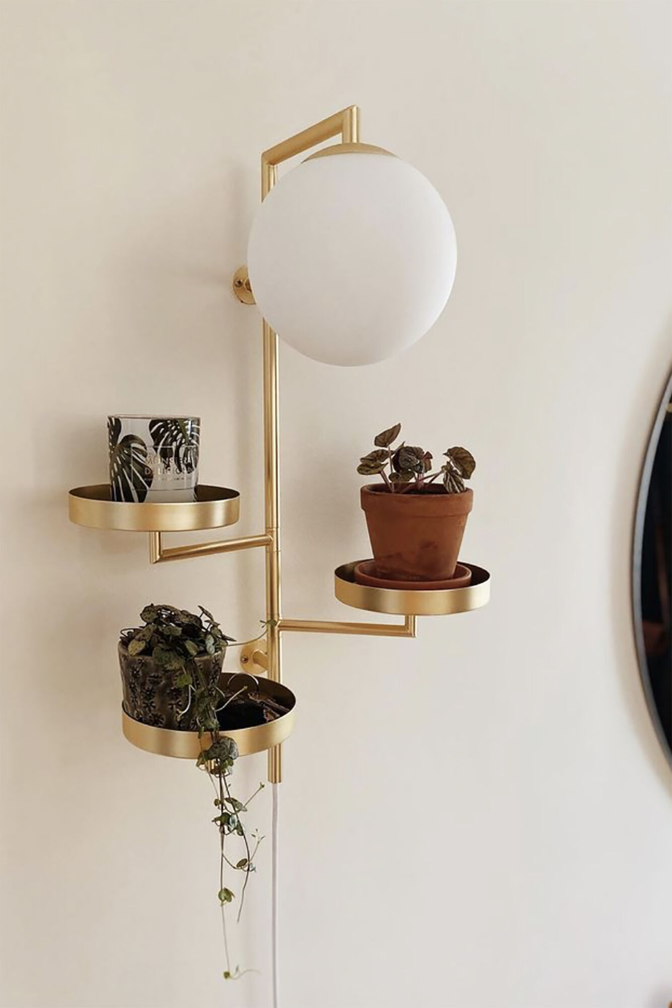Astoria är en läcker vägglampa som kombinerar funktion och design, där den kan användas i allt från hallen, till piedestal, till sänglampa. Matta mässingsbrickor (15 cm) som är justerbara och opalvit glaskupa. Vit textilkabel med brytare.