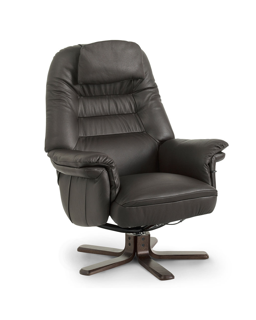 Svensktillverkad kvalitétsfåtölj från Möbelform. Med steglöst fällbar rygg och snurrfunktion. Visas här i läder/konstläder basel svart och ben i mahognybets. Finns även matchande pall till fåtöljen.