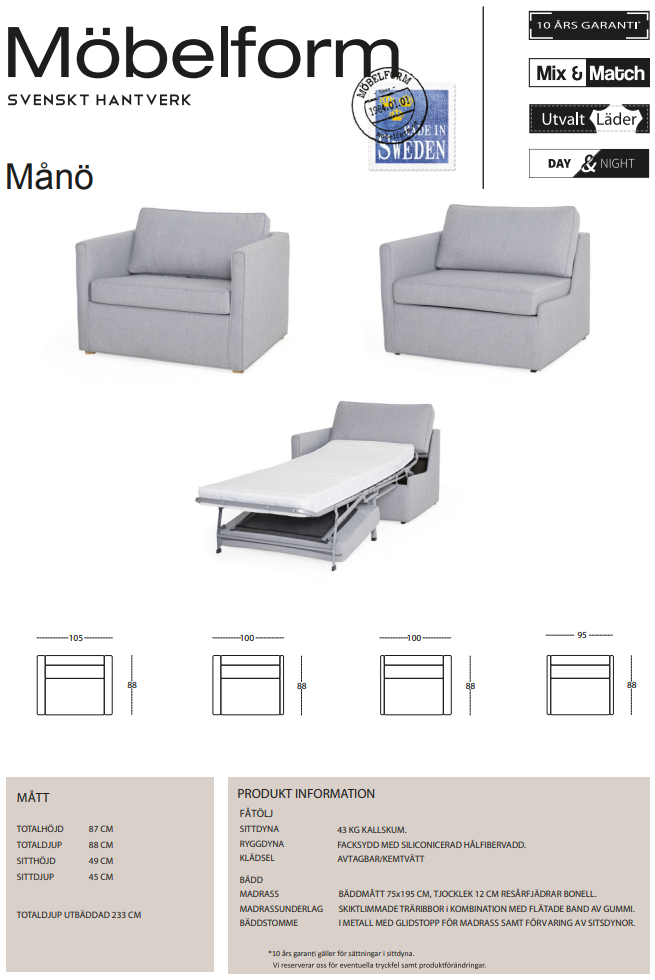 Månö från Möbelform är en svensktillverkad bäddfåtölj, en skön och bekväm fåtölj för både sittande och sovande. Framåtbäddad, bäddmått 75×195 cm. Bäddmadrass 12 cm i resårfjädrande bonell. Dynorna följer med mekanismen vid utbäddning och förvaras i soffan då soffan är utbäddad. Finns med armstöd på båda sidor, ett armstöd och en täcksida eller två täcksidor. Valet är ditt. Sittplymå med stoppning av 43 kg kallskum för bra komfort! Tyg- eller läderklädsel.