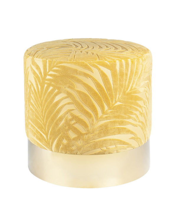 Sittpuff Palma, en dekorativ pall som är en snygg detalj i inredning. Pallen har härligt gul sammetslook med palmbladsmönster och en snygg mässingskant nertill.