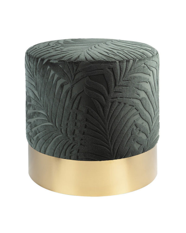 Sittpuff Palma, en dekorativ pall som är en snygg detalj i inredning. Pallen har härligt mörkgrön sammetslook med palmbladsmönster och en snygg mässingskant nertill.