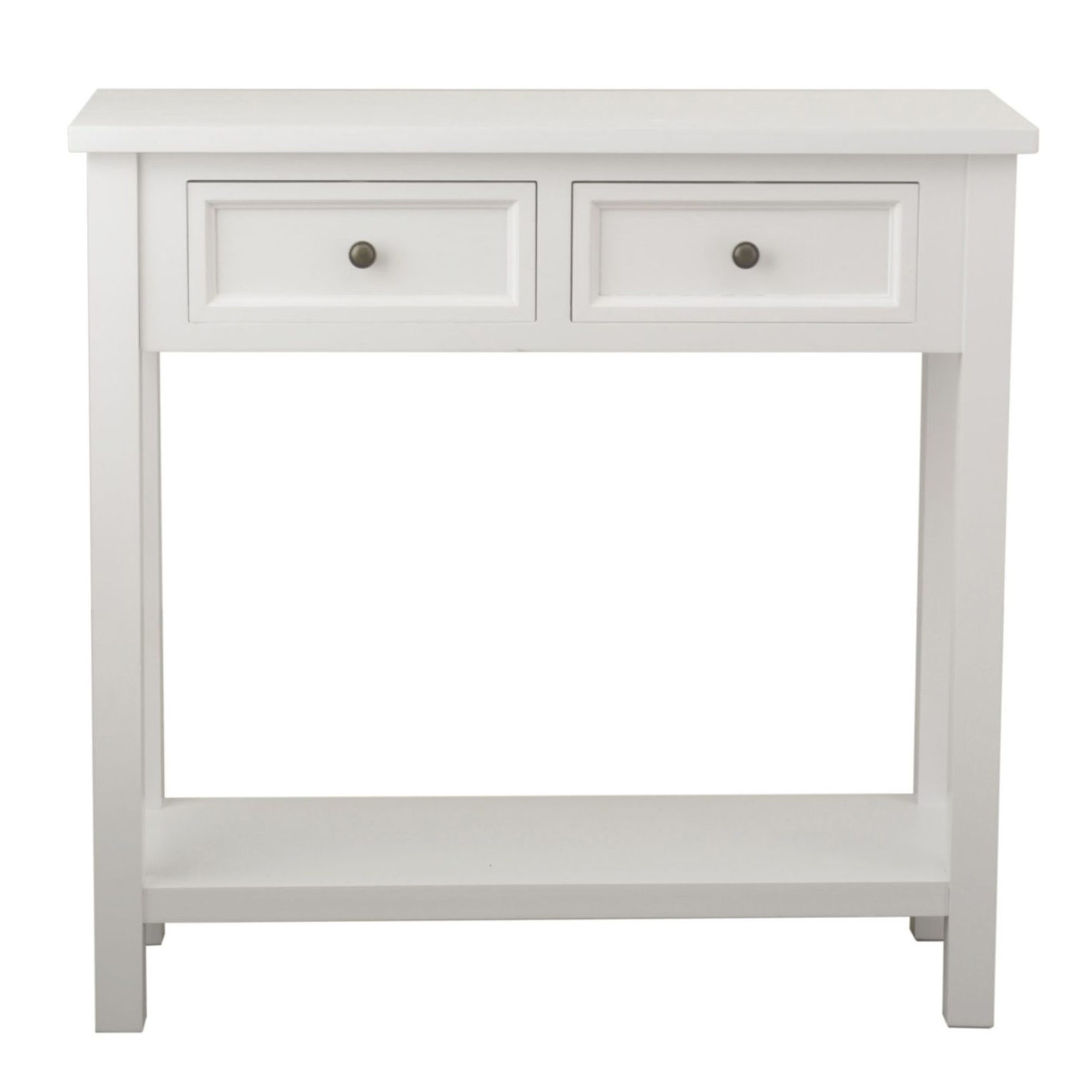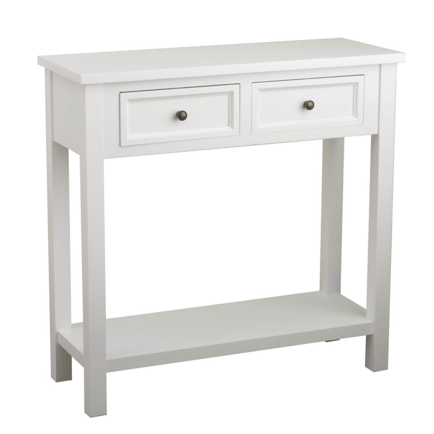 Litet och nätt konsollbord i lantlig stil med vit finish. Med två lådor och praktisk underhylla.