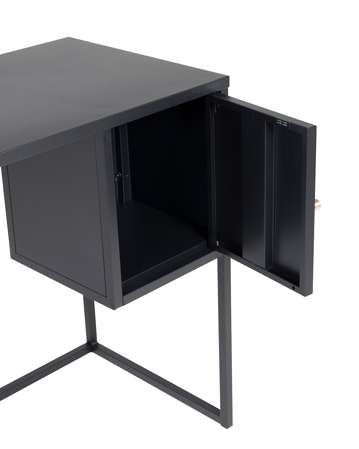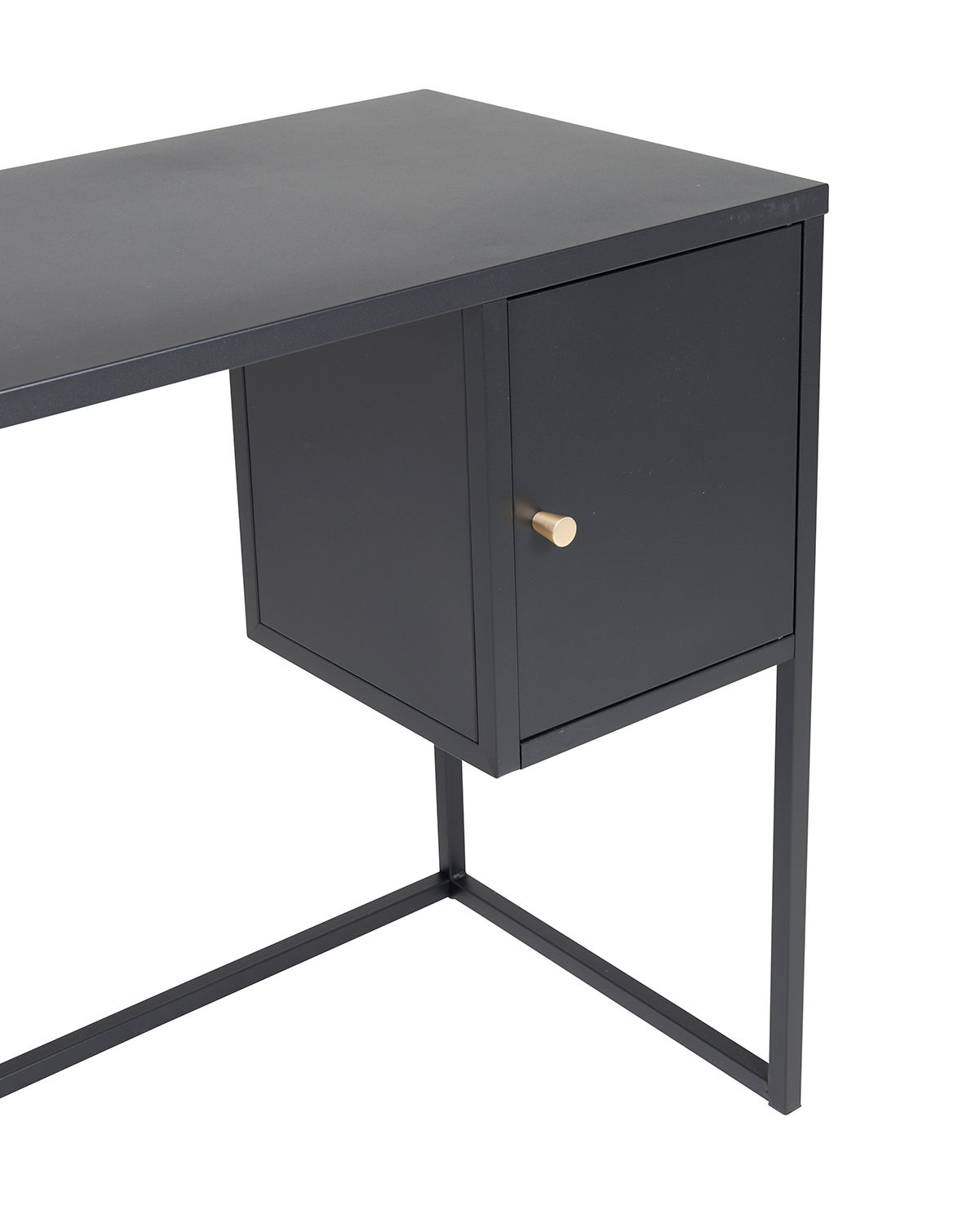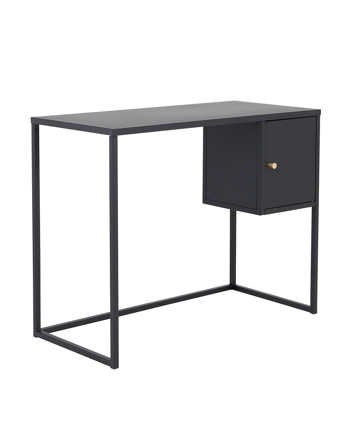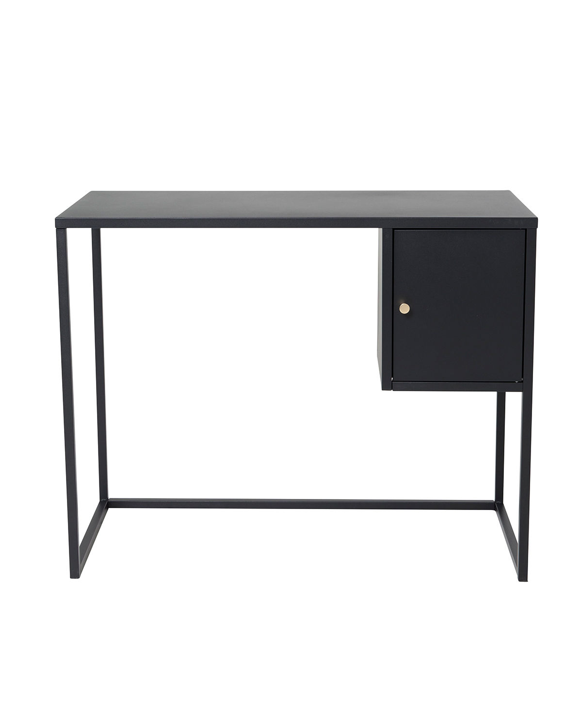 Bakal är ett nätt, dekorativt och stilrent skrivbord i pulverlackerad svart metall. Med en praktiskt skåp med magnetfäste och mässingsfärgad knopp.