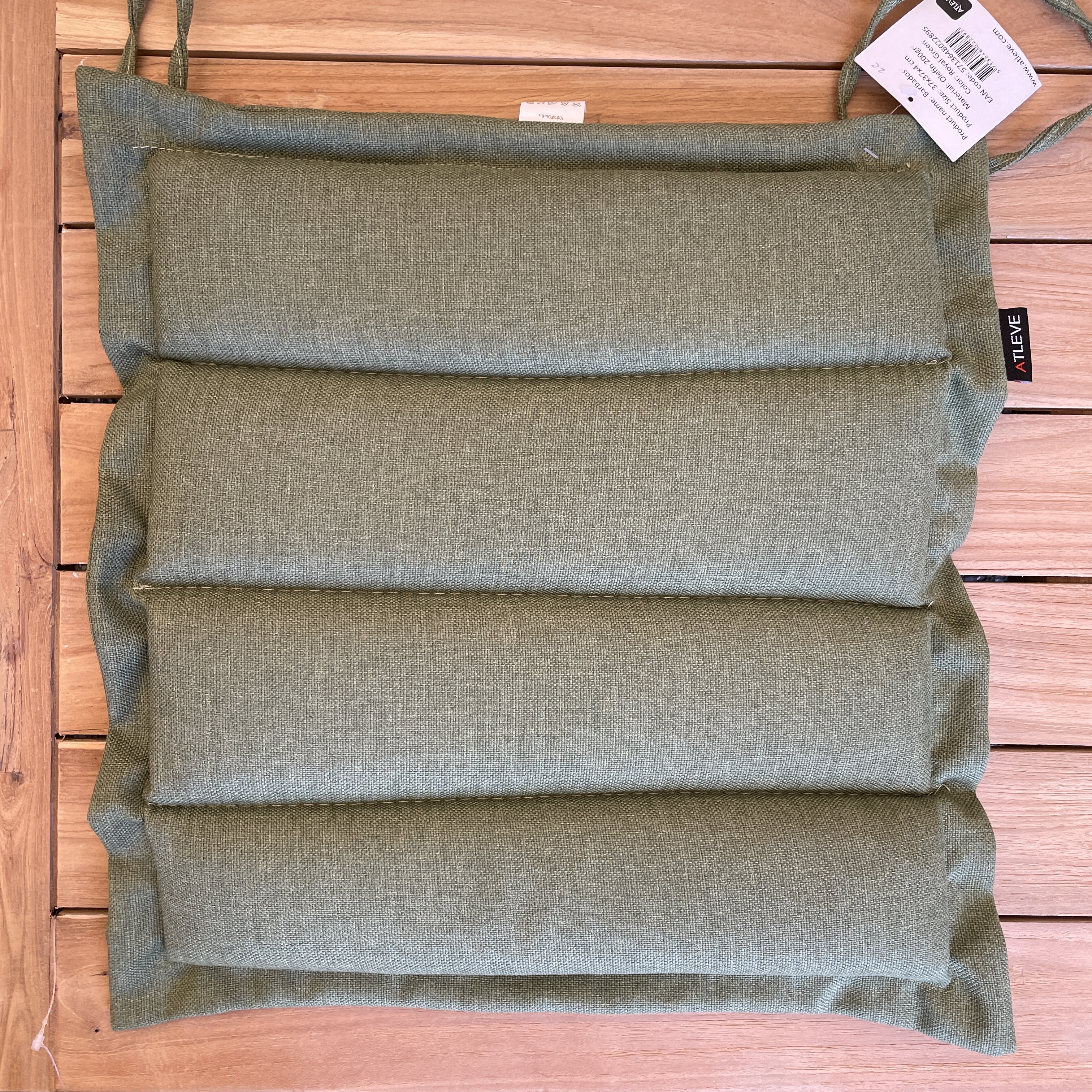 Barbados sittdyna, sydd med dekorativa ränder och fin vinge runt om. Har praktiska band så dynan kan knytas fast.