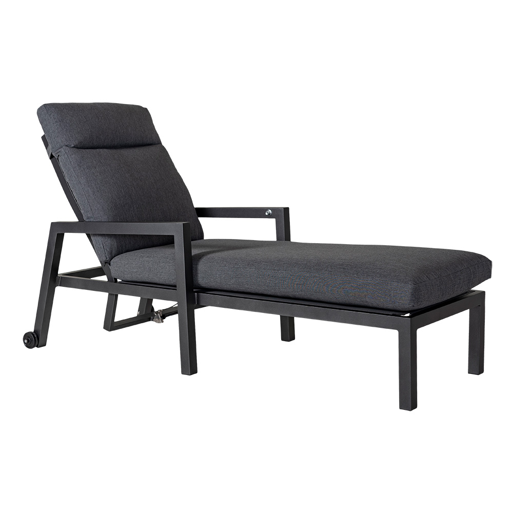 Modern solsäng i aluminum med hög komfort tack vare rejäl, tjock dyna i tåligt olefintyg. Tillverkad i tålig antracitgrå aluminium med mörkgrå dyna. Solsängen har praktiska hjul som underlättar förflyttning och en steglös ställbar rygg med gasfunktion för bästa komfort.