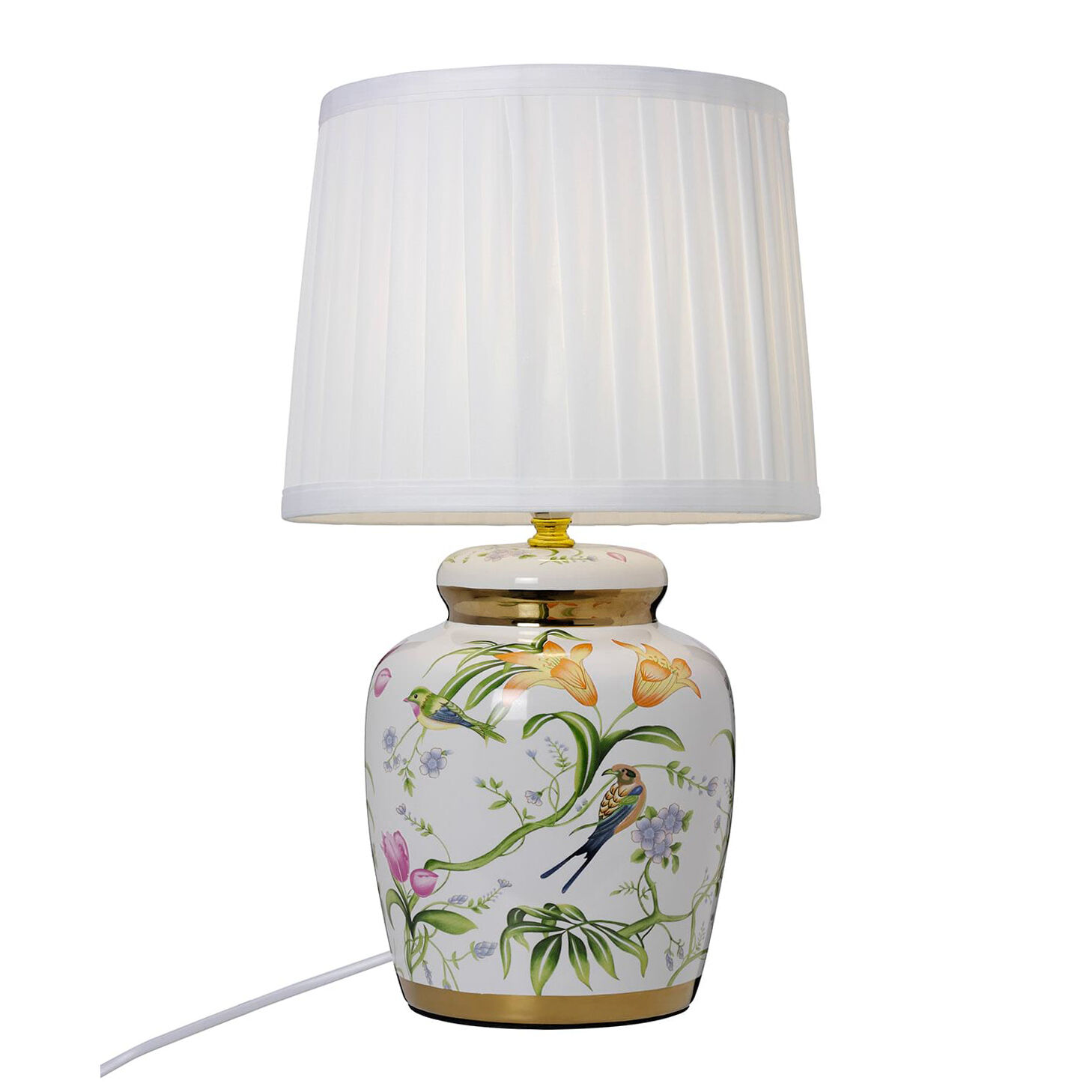 Klassisk bordlampa i keramik, vit botten med att vackert naturmönster och handmålade gulddetaljer. Till lampan medföljer en vit textilskärm. Lampan har en vit kabel med brytare.
