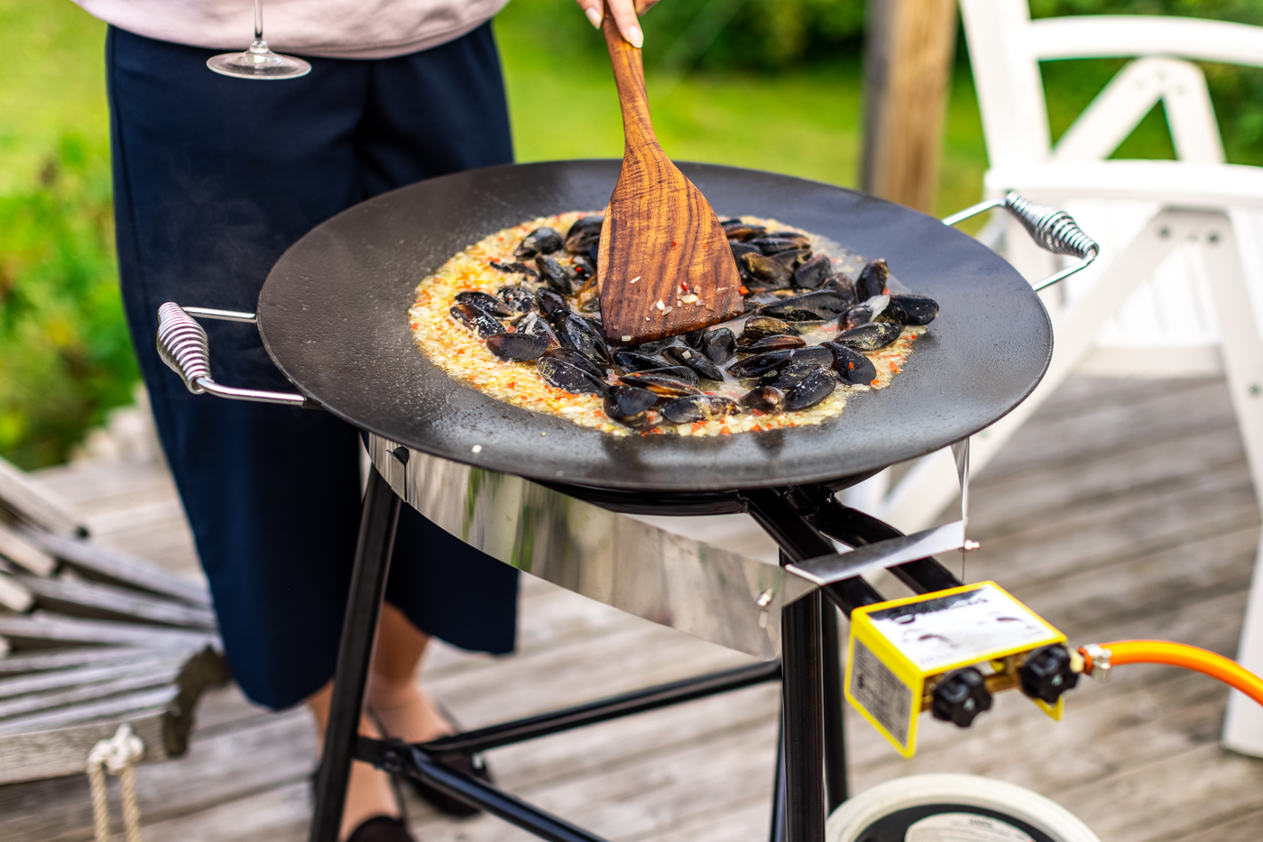 Vår mest populära stekhäll för upp till 8 personer. En allroundhäll som passar för både små och stora sällskap. Lika perfekt på utflykten som i uteköket i trädgården. Hällen kan användas i kombination med medföljande gasolbrännare på stativ men också på en grill eller direkt över öppen eld. Hällen är tillverkad av högklassigt varmvalsat stål och levereras fabriksinoljad. Stilrena handtag, i kromat fjäderstål, har hämtat både inspiration och funktion från vackra och rejäla gamla vedspisar, handtagen håller sig svalare än hällen.