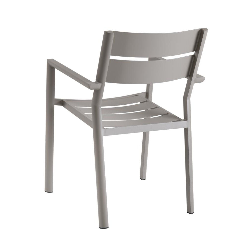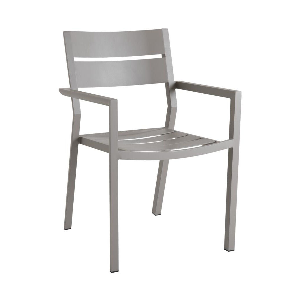 Karmstol Delia, en modern, lättplacerad stol med arm. I mattlackerad aluminium. Stolen är stapelbar och därmed smidig att förvara. Från Brafab.