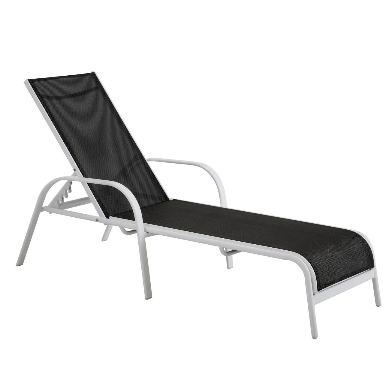 Rana är en stilren och enkel solsäng i vit aluminium med antracitgrå textilene på liggytan. Ställbar rygg.