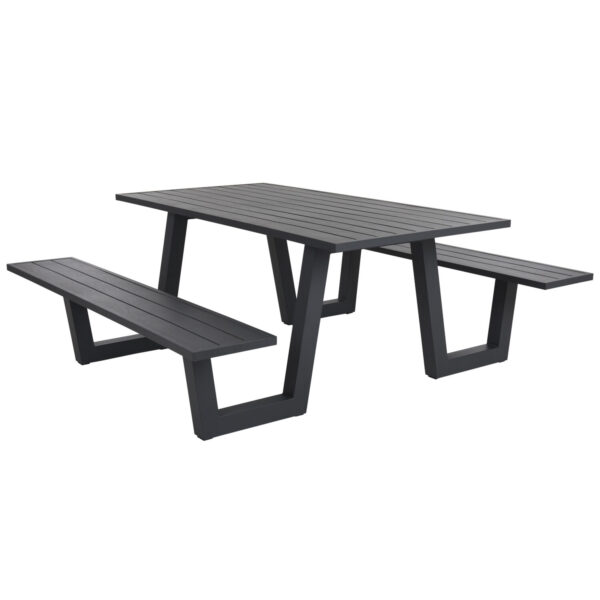 Bolid är ett elegant och modernt picnicset i grålackad aluminium som är godkänd för offentligt miljö. Bolid är helt underhållsfri och klarar av att stå ute hela året. Den är lackad med en snygg antracitgrå pulverlack.