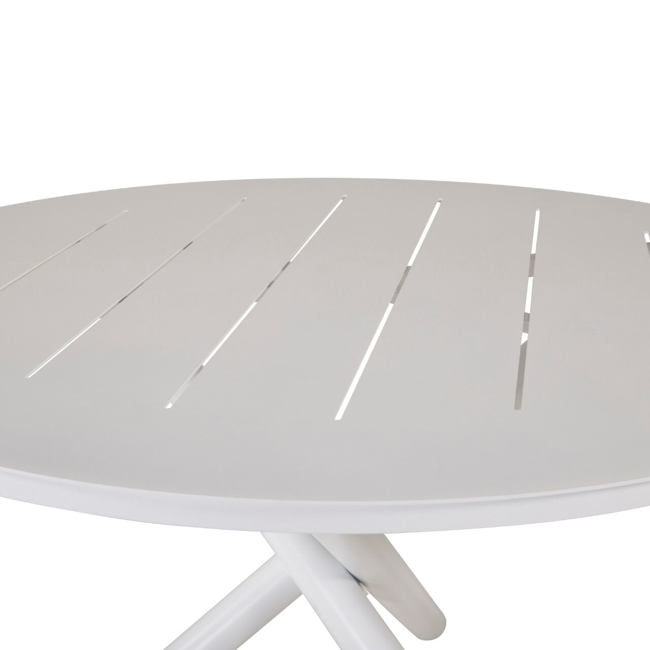 Alma - ett runt matbord i en stilren design som passar in i de flesta miljöer. Bordet är tillverkat i vit aluminium, ett robust material som står sig över tid. Skapa en charmig mittpunkt där ingen hamnar på kanten och njut av härliga stunder tillsammans med familj och vänner!
