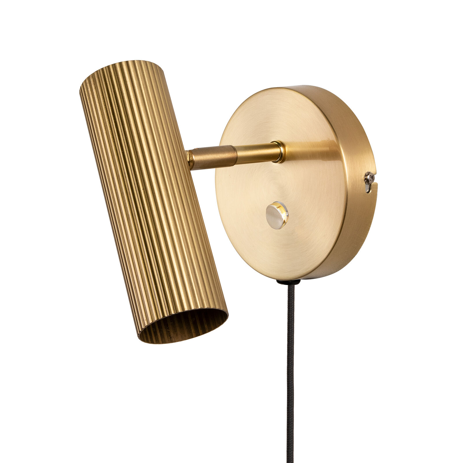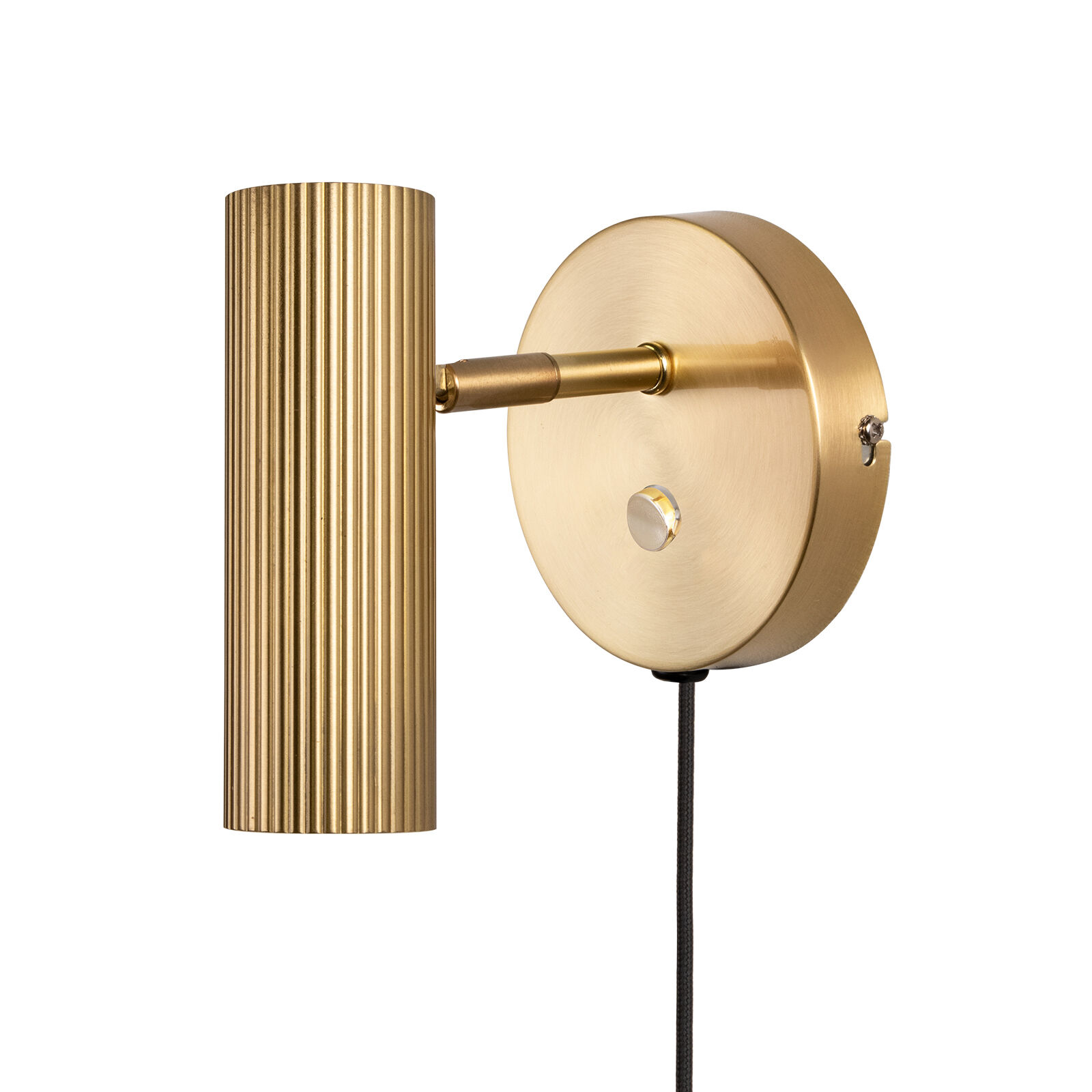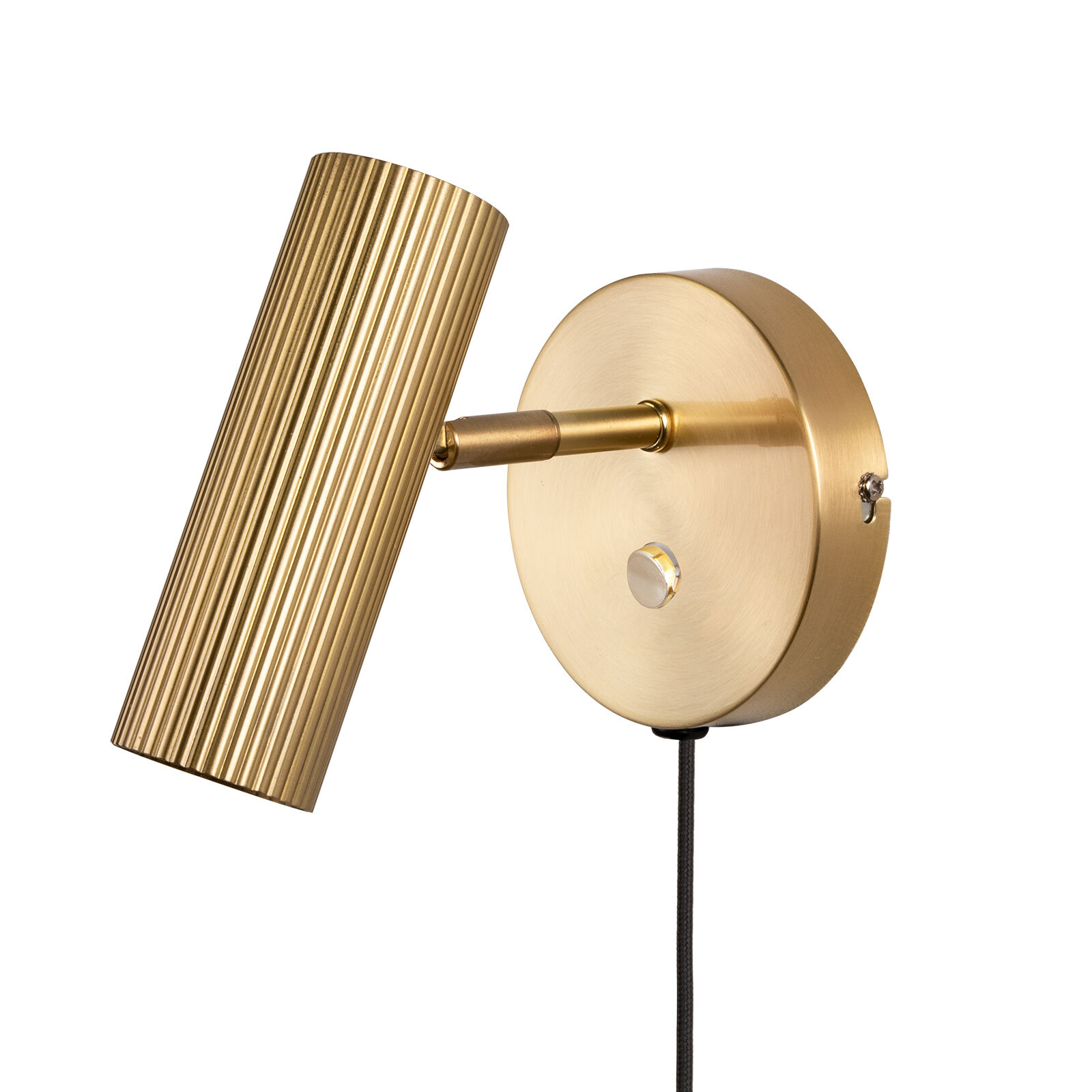 Hubble är en modern vägglampa med tubformad enkel räfflad skärm i metall. Skärmen är vinklingsbar i höjd- och sidled. Lampan är gjord i borstad mässingsfärgad metall och har en 200 cm lång svart textilkabel samt brytare (on/off, ej dimmer) på väggplattan. Lampan kan enkelt användas för fast installation om så önskas.