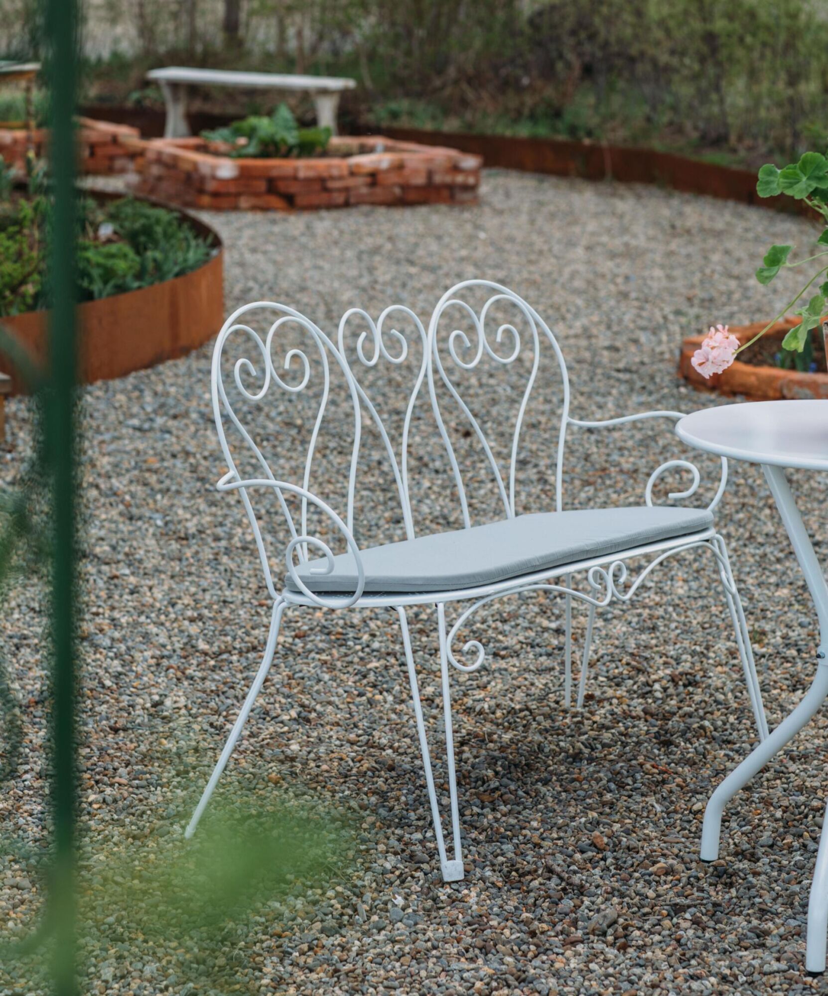 Soffa med ”vintagekänsla” i vitt epoxylackerat stål. Levereras med dyna i grått.