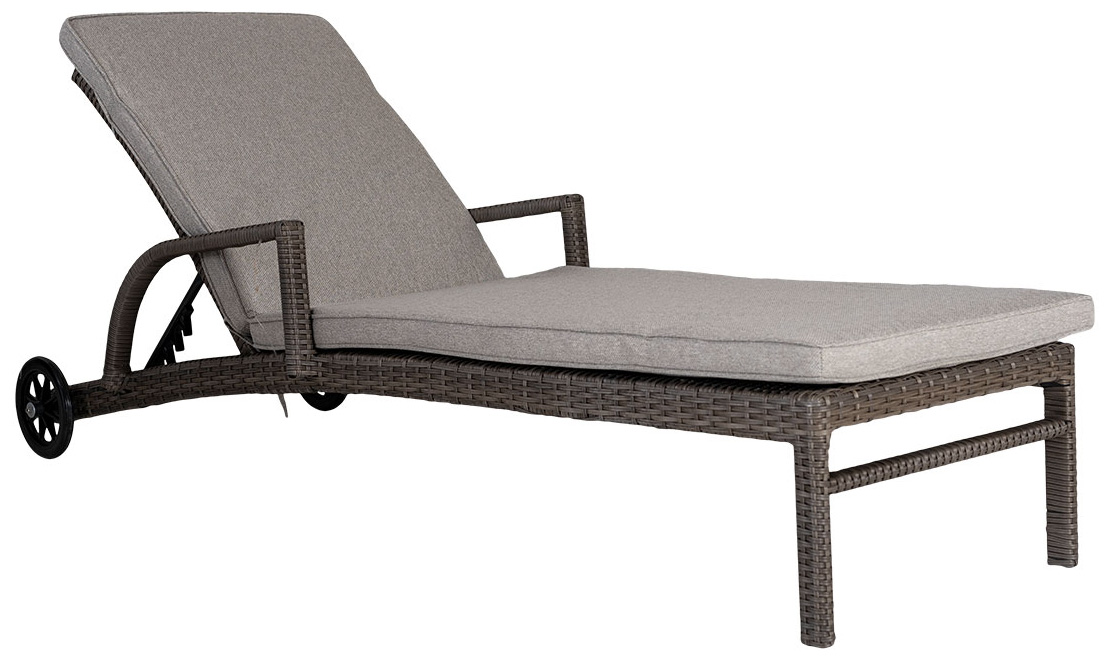 Solsäng Costa i konstrotting med stomme av aluminium. Solsängen har justerbart ryggstöd och är försedd med 2 hjul i bakkant för att du enkelt ska kunna flytta den. I priset ingår en dyna i olefinväv. Här i färgen driftwood, med dyna i fägen lin.