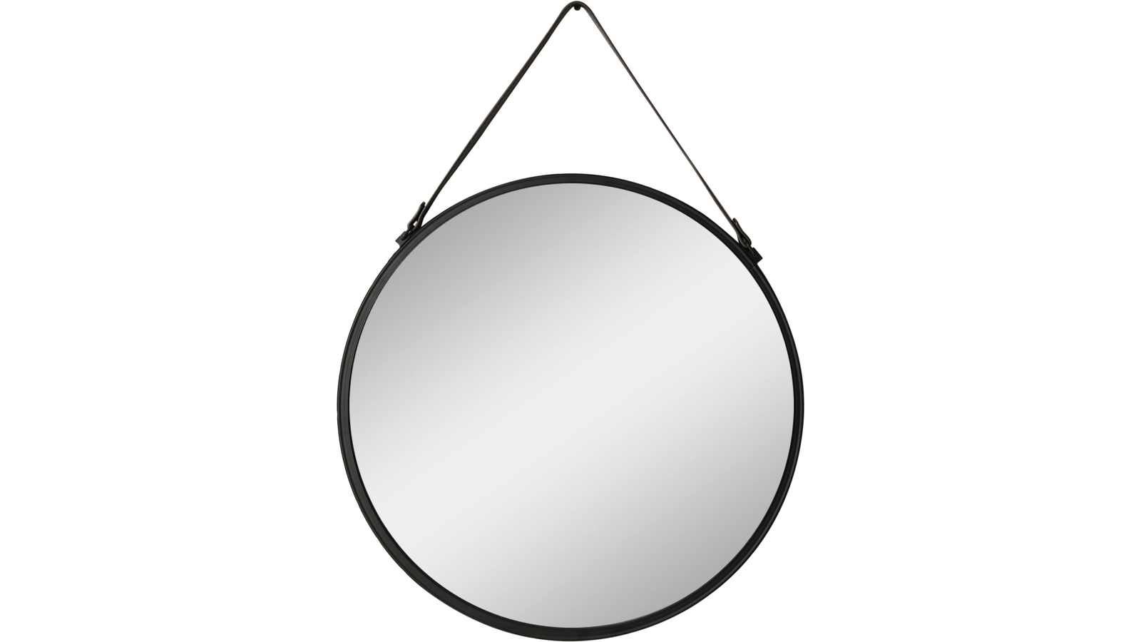 Soltar är en rund spegel med kant i svart metall och snyggt hänge i svart konstläder.