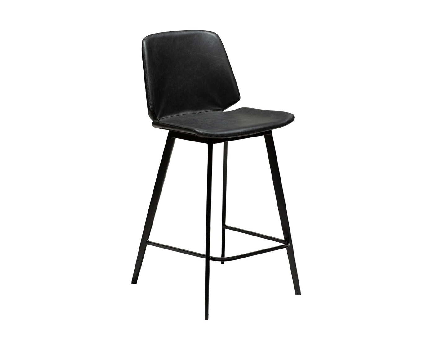 Swing – modern och snygg barstol från danska Dan-Form. Swing är den perfekta blandningen mellan raka linjer och runda former. Här i den lägre barstolshöjden, sitthöjd 65 cm. Klädd i ett slitstarkt och elegant konstläder i en vintage svart nyans. Benen är tillverkade i robust svartlackad metall. Swing finns även i en högre barstols modell, sitthöjd 76 cm.