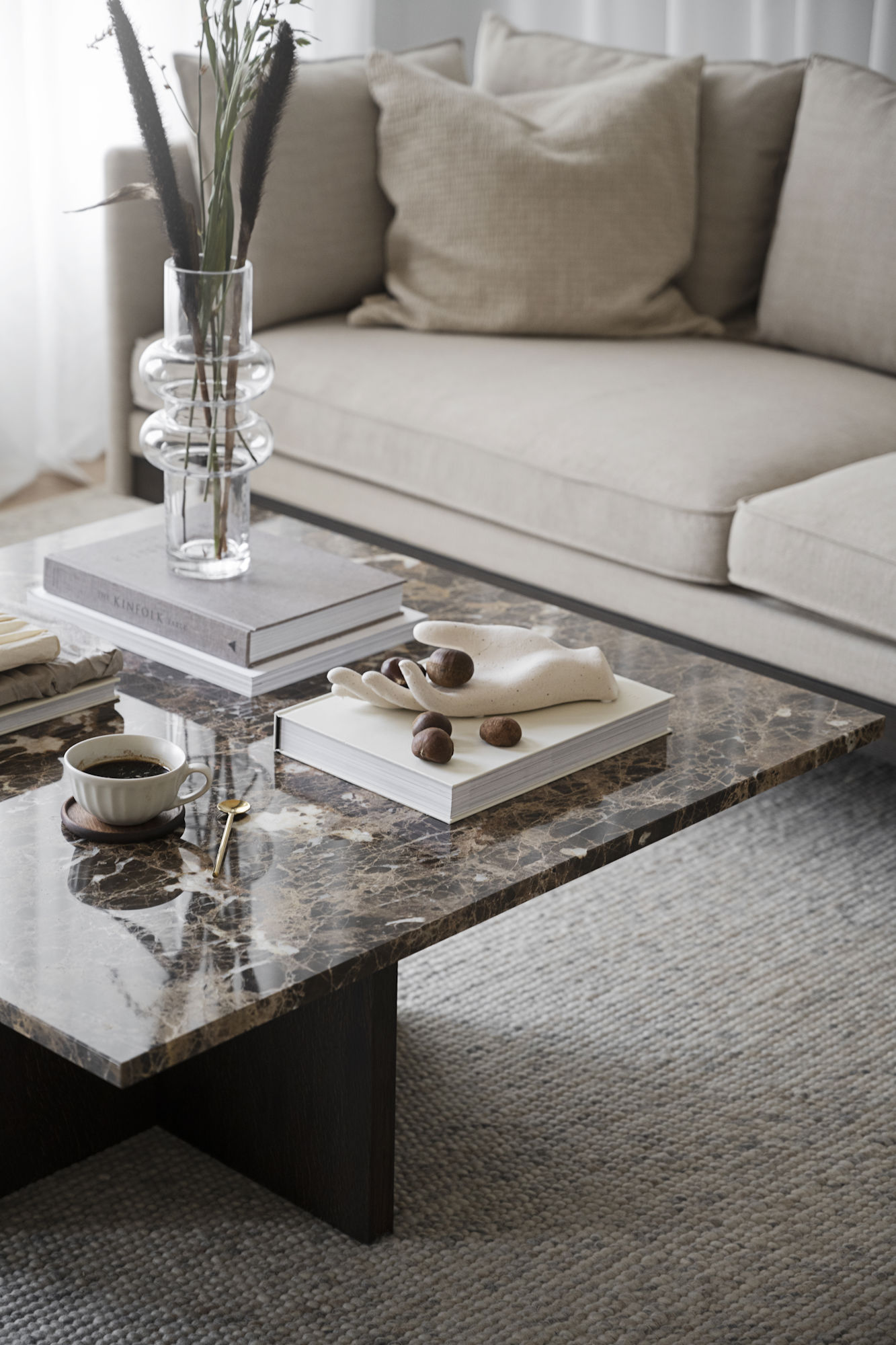 Lyxiga soffbordet Brooksville i Japandi-stil där den skandinaviska designen möter japansk minimalism. Den kvadratiska bordsskivan av exklusiv Emperador-marmor tillsammans med kryssunderredet av FSC-certifierat brunt trä skapar ett hållbart soffbord och ger en rofylld känsla i rummet. Soffbordet ingår i Brooksville-serien där du kan välja underrede i brunt eller vitpigmenterat trä samt rund eller kvadratisk bordsskiva i brun eller vit marmor.