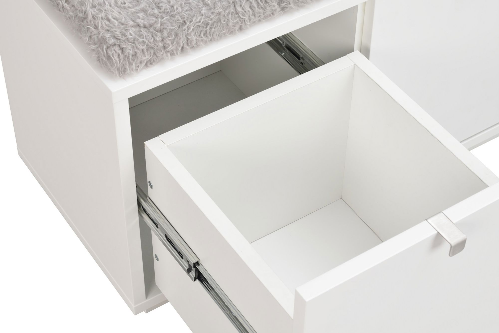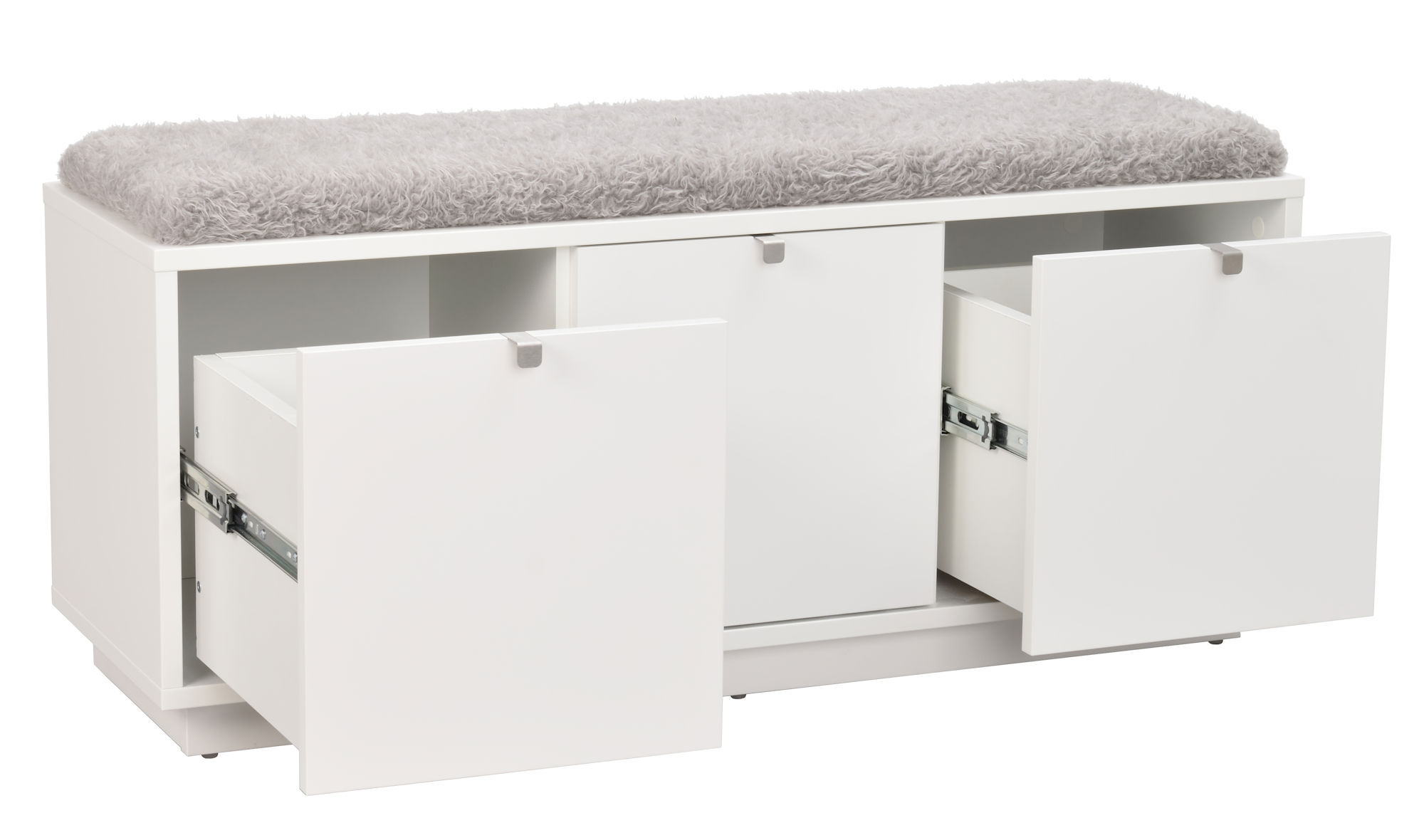 Confetti sittbänk i vitlackad MDF med dyna i fårskinnsimitation. Praktisk och stilren sittbänk med tre rymliga lådor som tar hand om förvaringen. Ingår i hallserien Confetti.