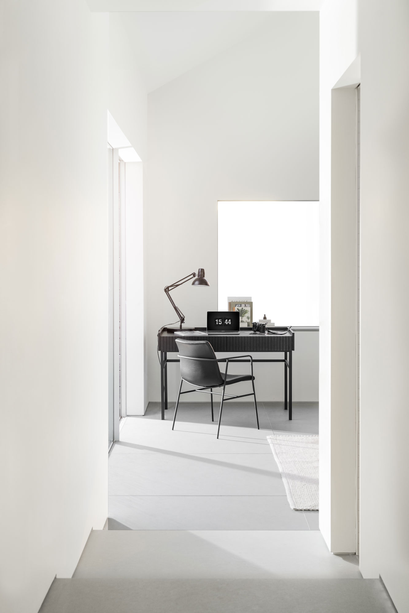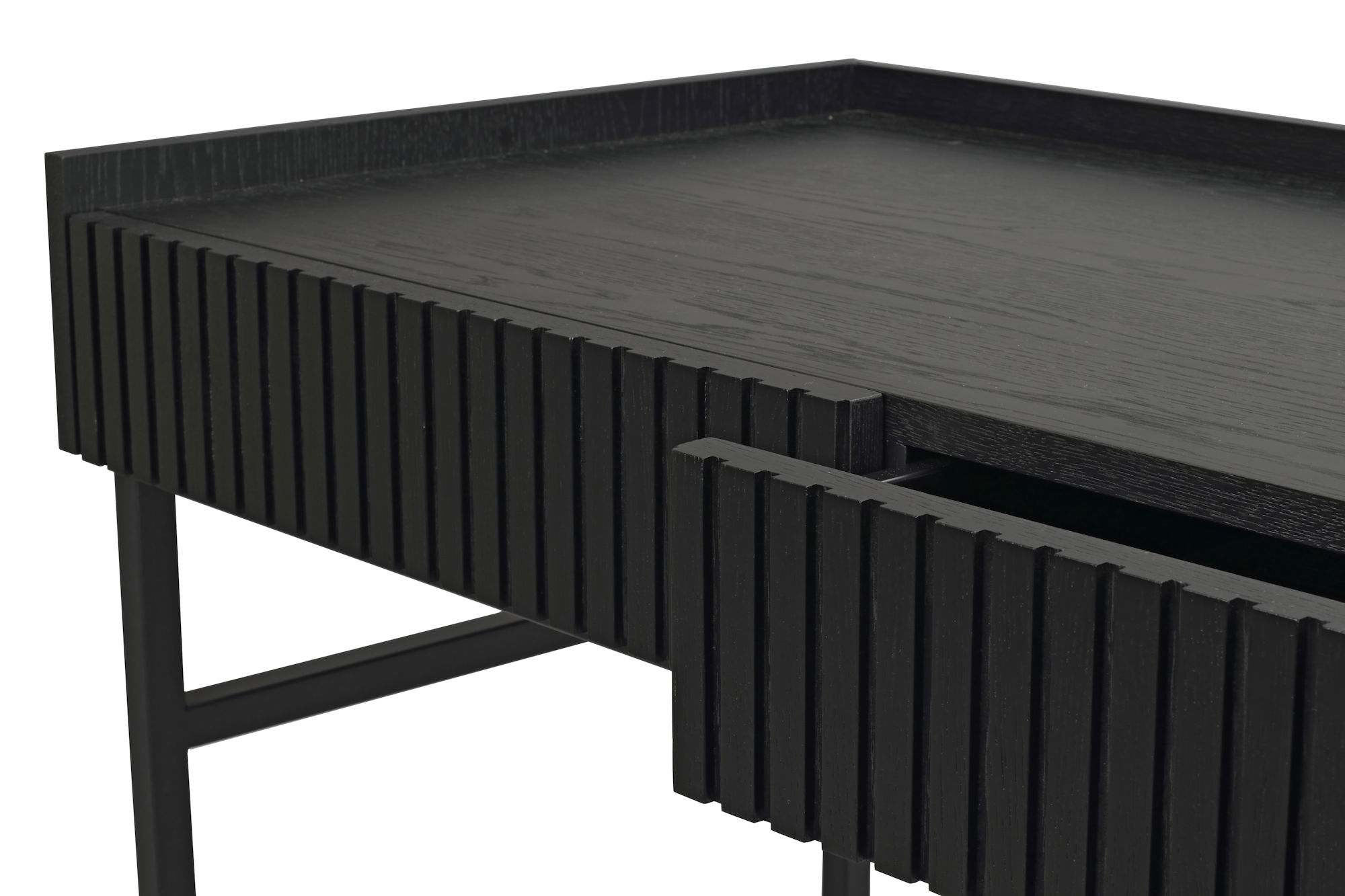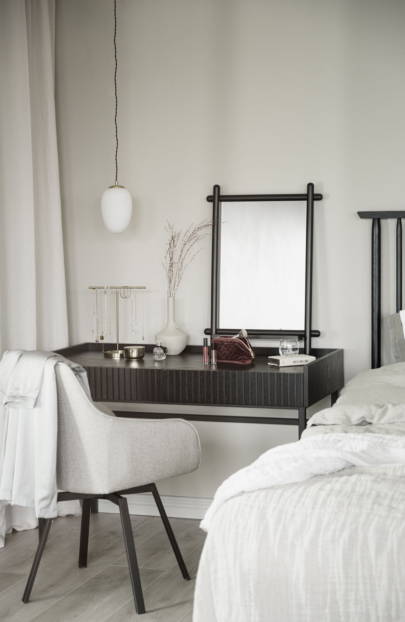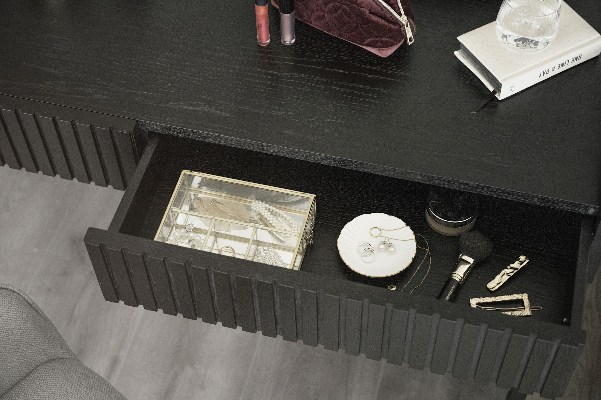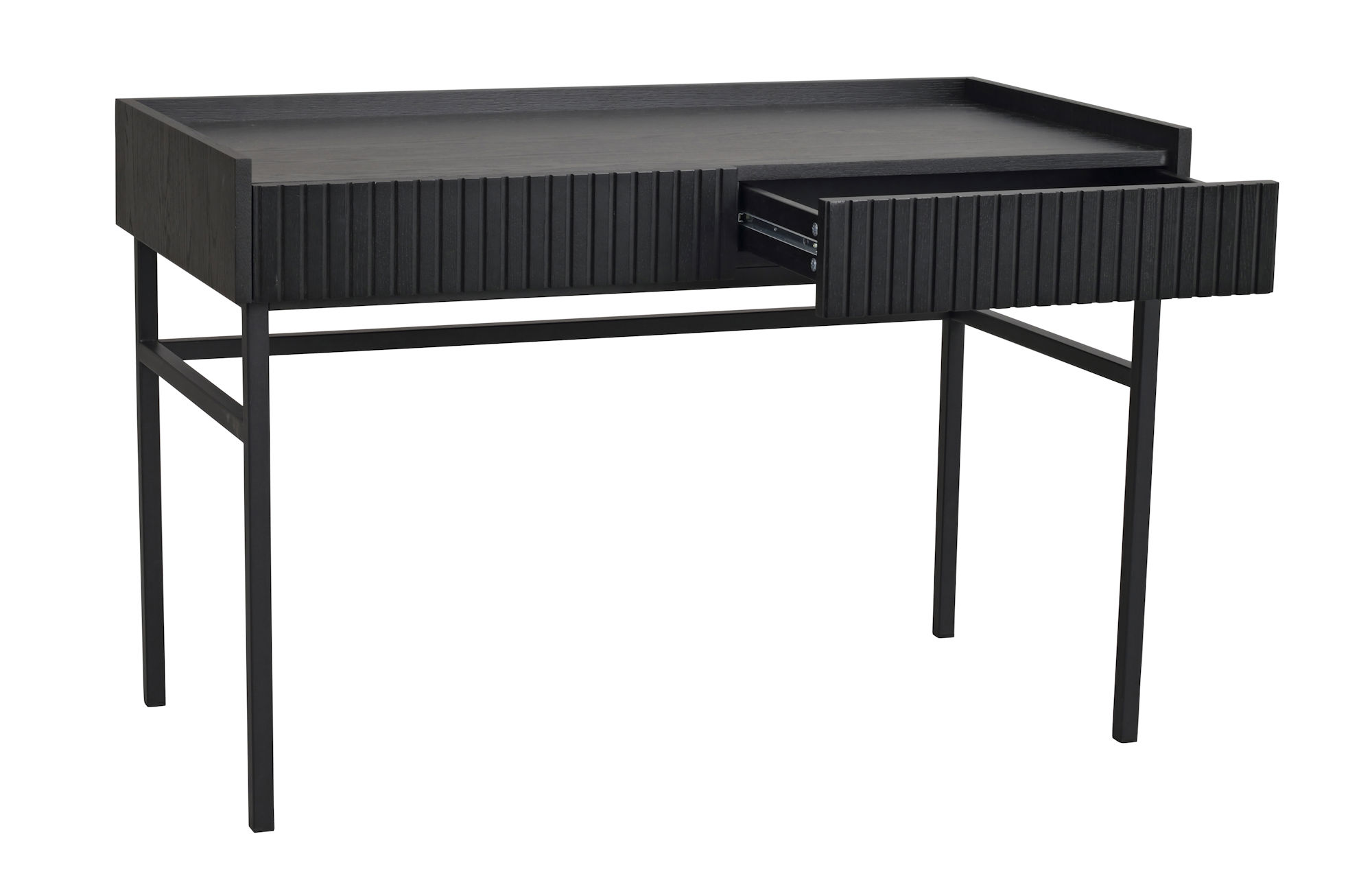 Halifax skrivbord passar perfekt till det stilrena hemmakontoret eller som sminkbord i sovrummet. I skrivbordet finns två utdragbara lådor med dolda hål förberett där du själv väljer om du vill montera de medföljande guldfärgade knopparna i borstad metall. Skrivbordet har även en praktisk sarg runt bakre delen av bordskivan som skapar avskildhet och skydd åt papper och annat. Kombinera gärna Halifax skrivbord med förvaring i samma serie för ett elegant helhetsintryck.