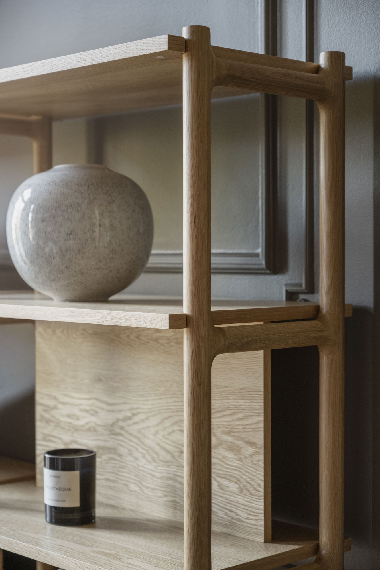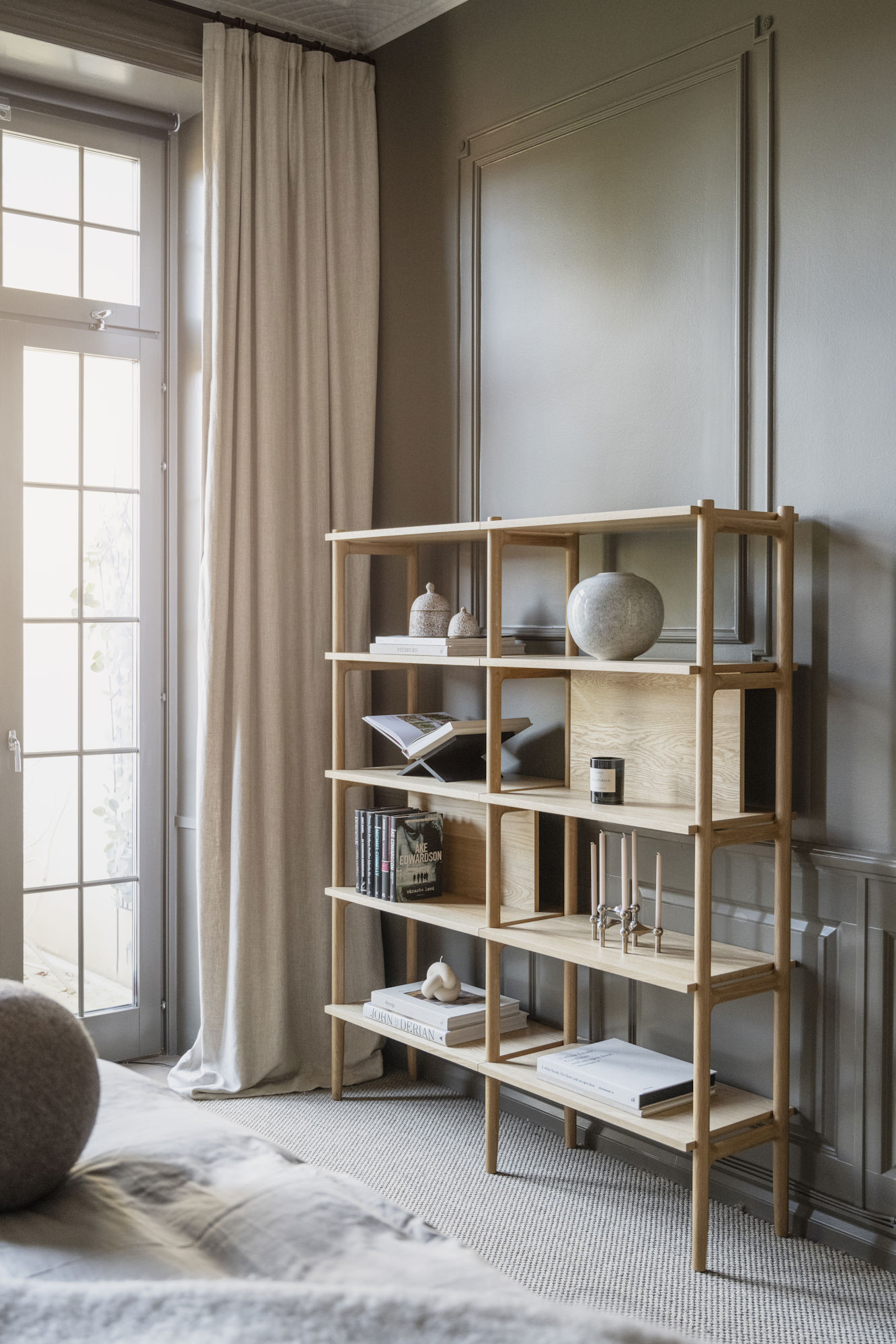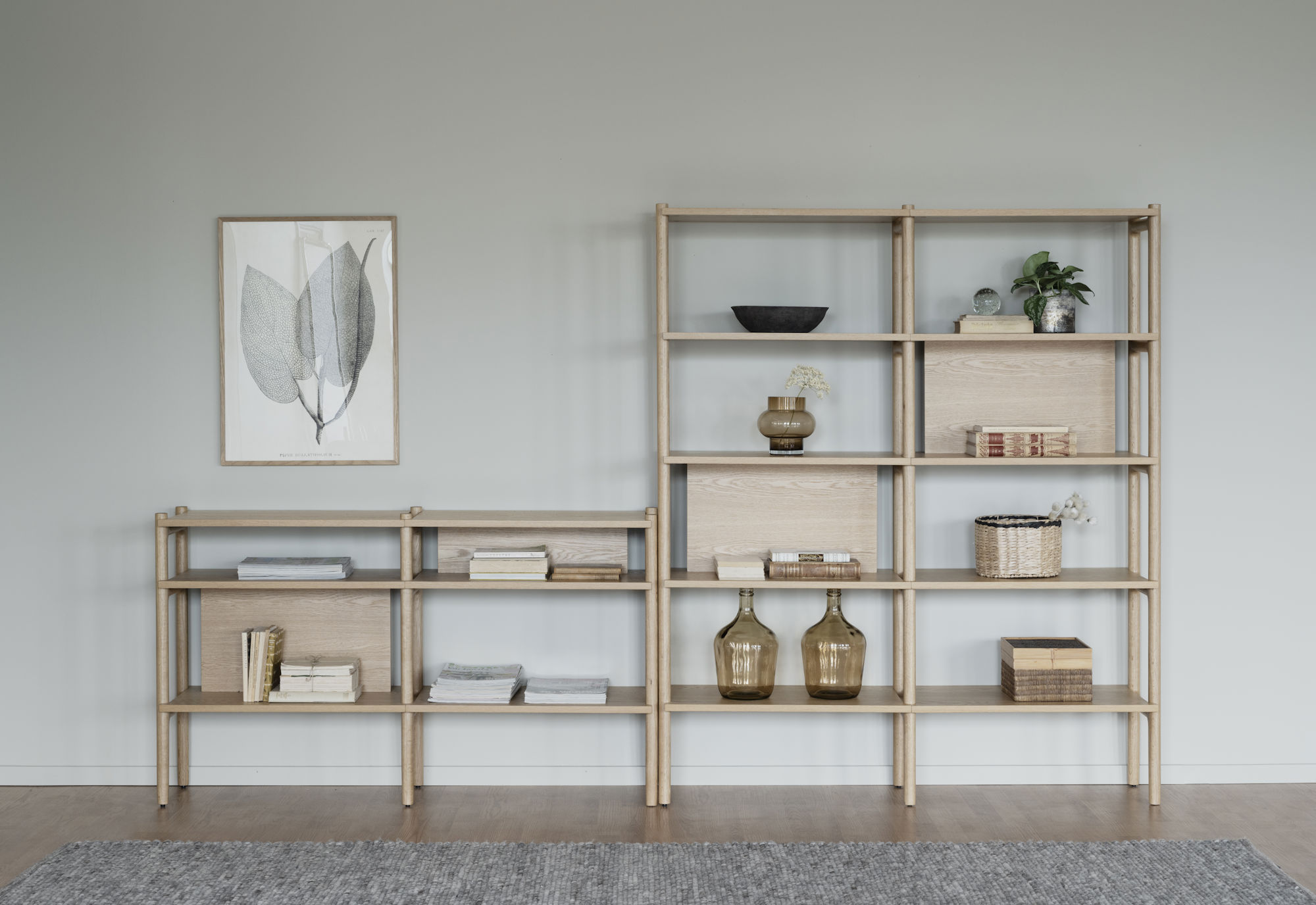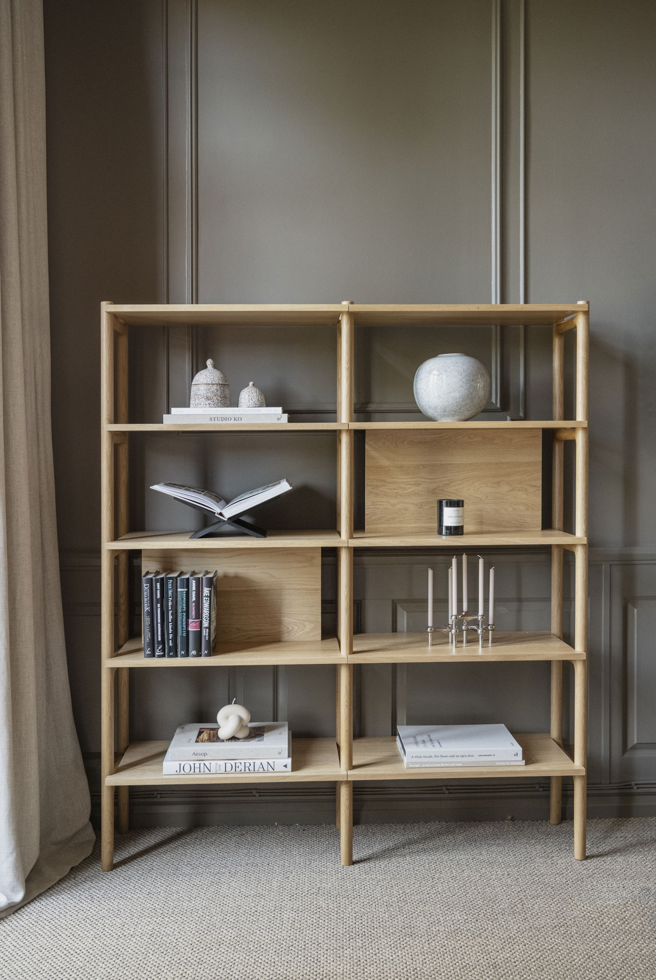 Holton bokhylla i ek 140x166 cm har 10 st hyllplan i ekfaner och massiva formsvarvade gavlar. Holton är en välarbetad hyllserie i nordisk design som rymmer mycket förvaring och blir ett snyggt blickfång i rummet. Hyllan fungerar även som en praktisk rumsavdelare och finns också i en lägre variant.