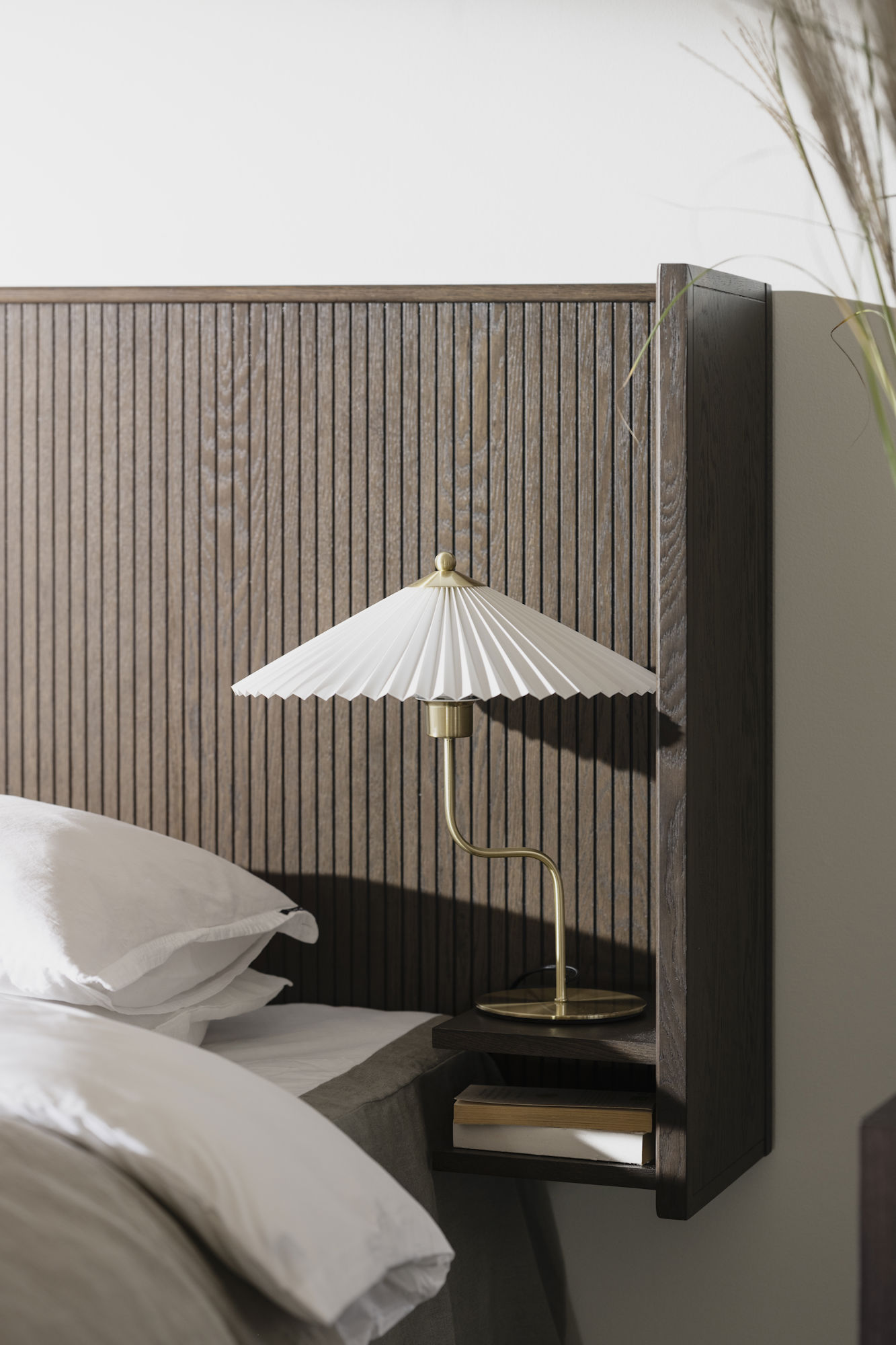 Redmond sänggavel är både elegant och exklusiv vilket ger dig en härlig hotellkänsla i ditt sovrum. Kombinera sänggaveln med pendellampor ovanför de integrerade sängborden och inredningsdetaljer i mässing för ett extra lyxigt intryck. Sänggaveln har ett dekorativt ribbat mönster i fin brun nyans och kan gärna placeras tillsammans med Clearbrook förvaring som har samma färg och vackra mönster. Redmond sänggavel passar perfekt till sängar som är 180 cm breda. Tack vare de justerbara metallbenen kan du själv välja höjd på sänggaveln, från 126 till 150 cm. Beslag för att fästa sänggaveln i väggen medföljer. Höjd exkl. ben: 85 cm.