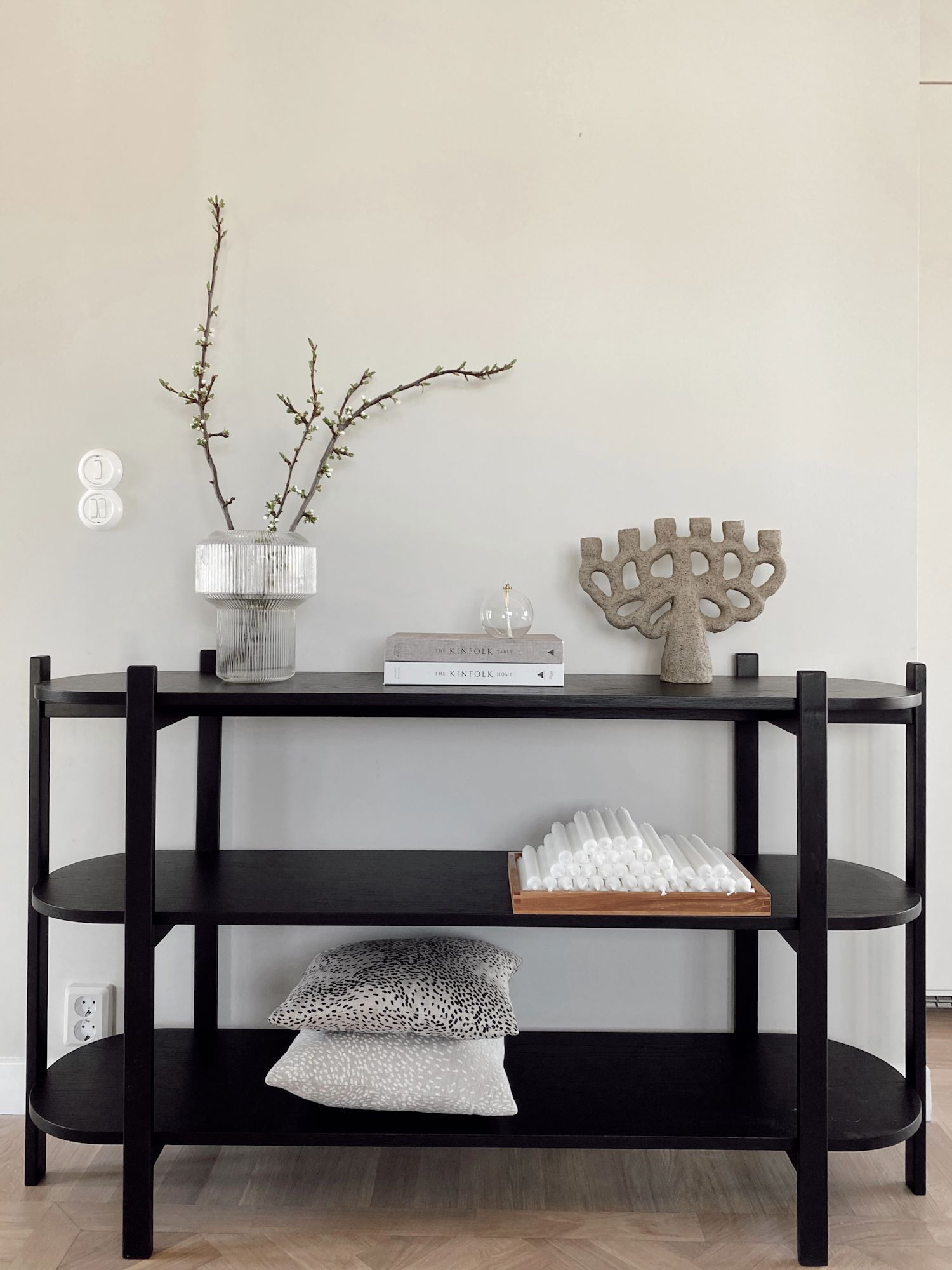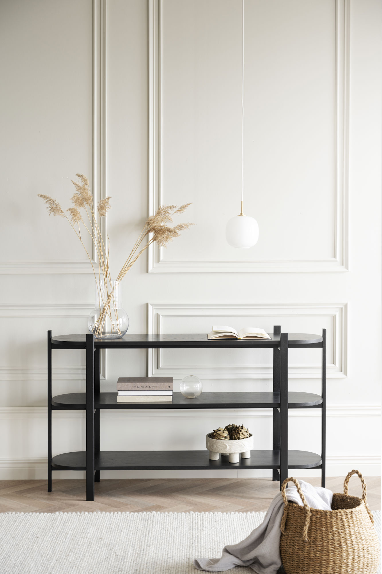 Tolsona är ett praktiskt och elegant svartlackat avlastningsbord med rundade hörn. Hyllan är lättplacerad i hemmet och passar perfekt både i hallen, sovrummet eller vardagsrummet. Tolsona avlastningsbord har sex stycken massiva ben som gör det stabilt samtidigt som det skapar ett exklusivt arbetat utseende.