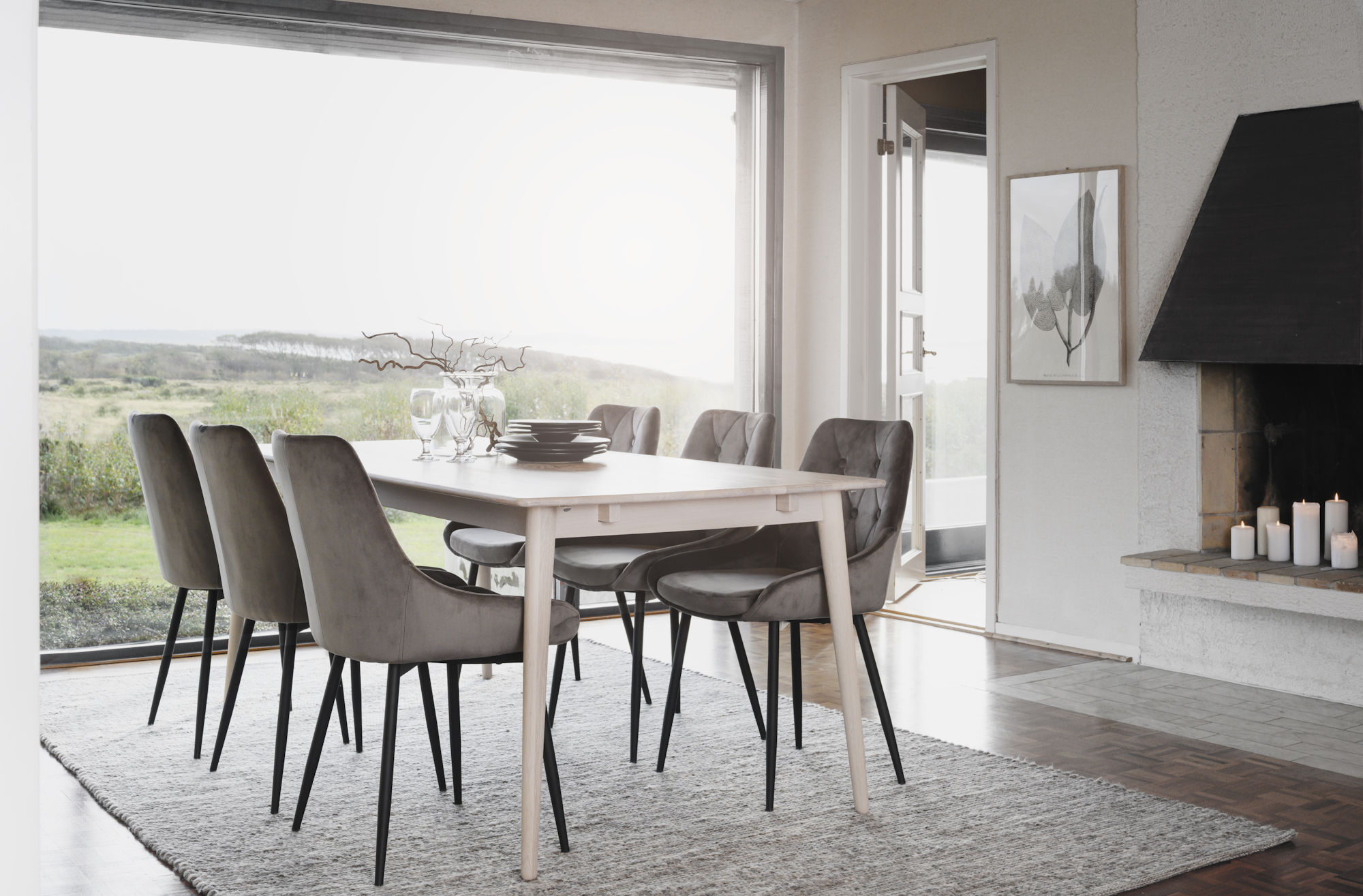 Tyler matbord i massiv vitpigmenterad ek är ett modernt och tidlöst matbord i 100% FSC-certifierat trä. Ytan är behandlad med vitpigmenterad olja för extra hållbarhet. Det går att köpa till tilläggsskivor om man vill ha möjlighet att förlänga bordet till 280 cm.