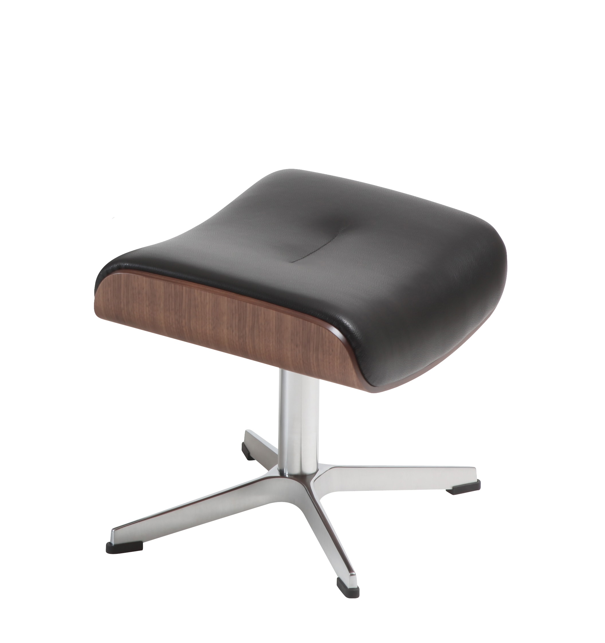 Fotpall som passar till fåtöljen Air. Här klädd i skinn Fantasy svart med balja i valnötsfanér och fot i formgjuten aluminium.