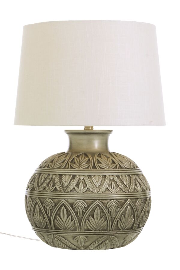 Snygg och maffig bordlampa i silver med skärm i vit textil.