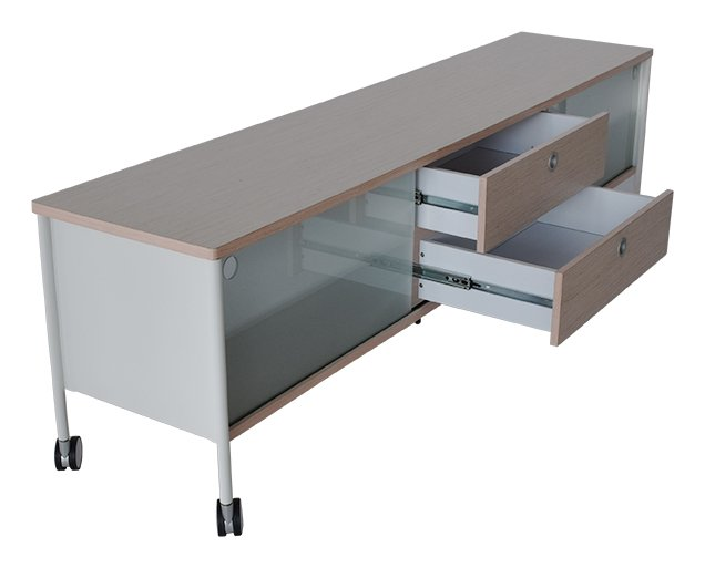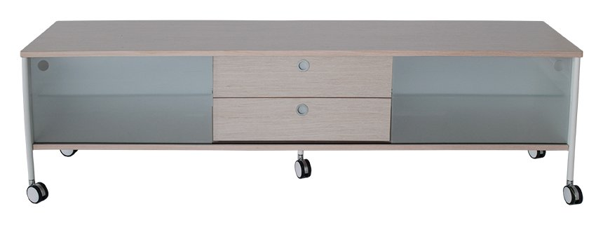 Alessi mediabänk 180 i ljus ek fanér med två luckor i frostat glas. Två lådor för praktisk förvaring!