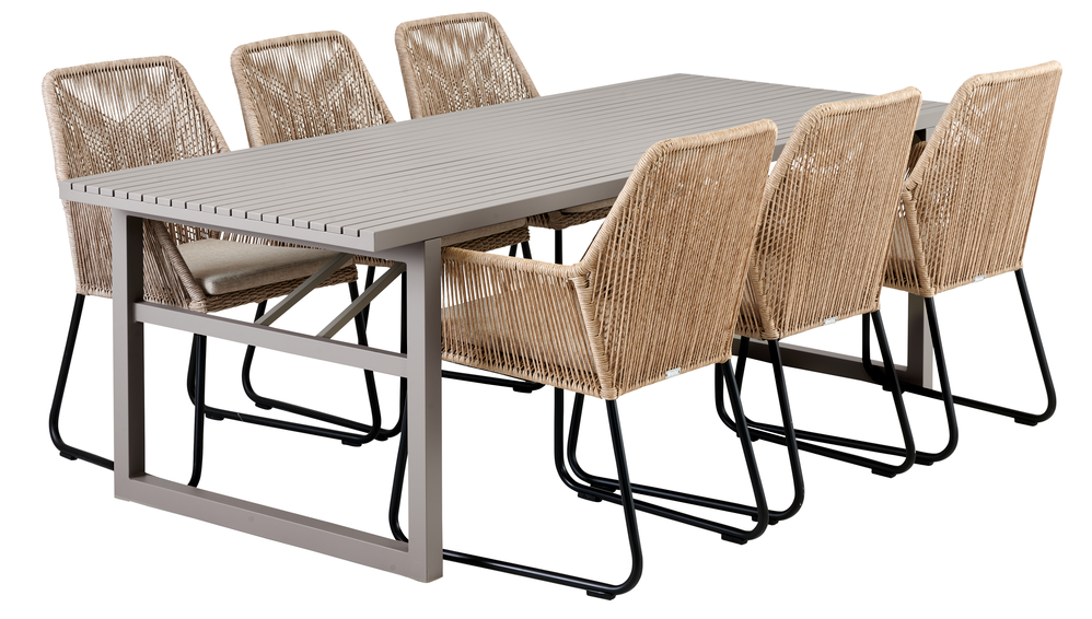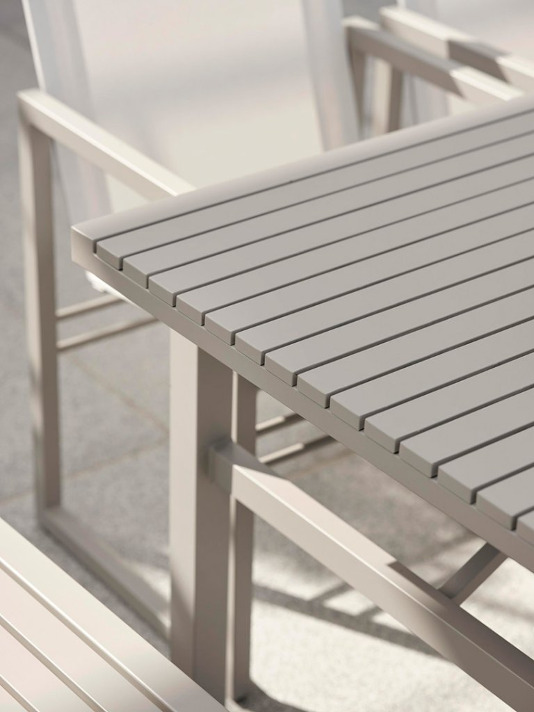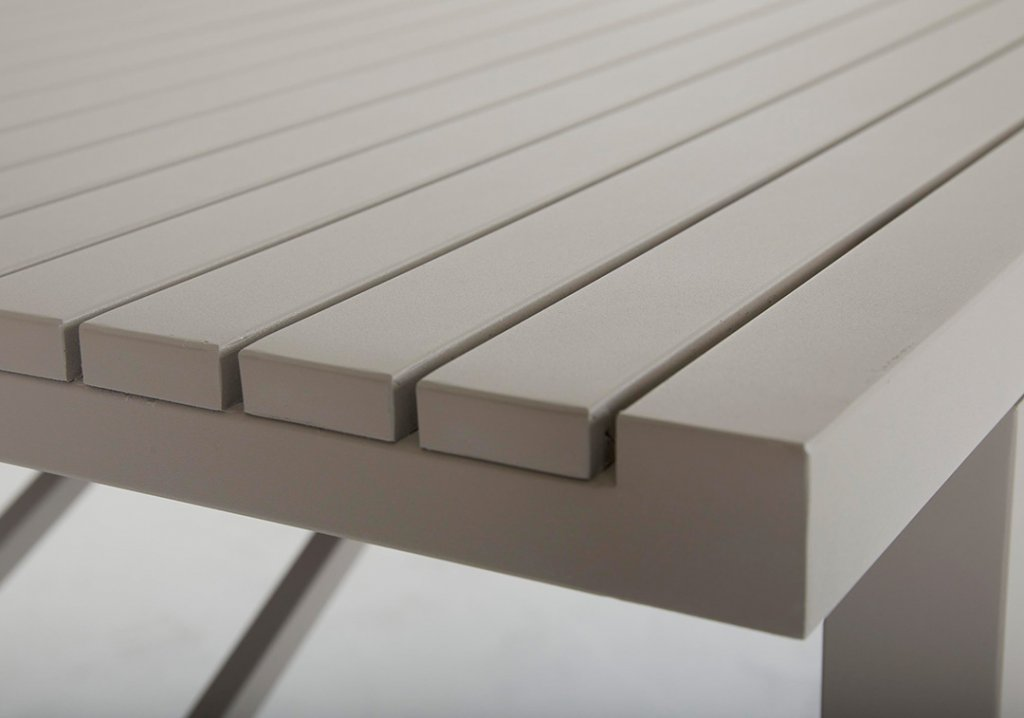 Vevi är ett elegant och modernt matbord i lackad aluminium från Brafab. Toppskivan har smala ribbor vilket ger ett modern och stilrent intryckt. Det nätta underredet ger Vevi både en modern och exklusiv känsla. Bordet är tillverkat helt i aluminium och är således helt underhållsfritt.