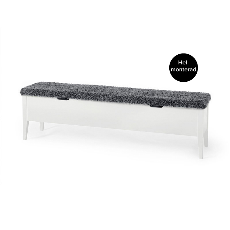 Välj mellan olika klädslar på toppen – grå fårskinnsimitation, äkta fårskinn, ljusgråa tyget Chelsea eller bruna tyget Abriamo. På insidan av bänken finns ett rymligt fack med en praktisk skiljevägg, som även går att tas bort för att göra plats för större föremål.