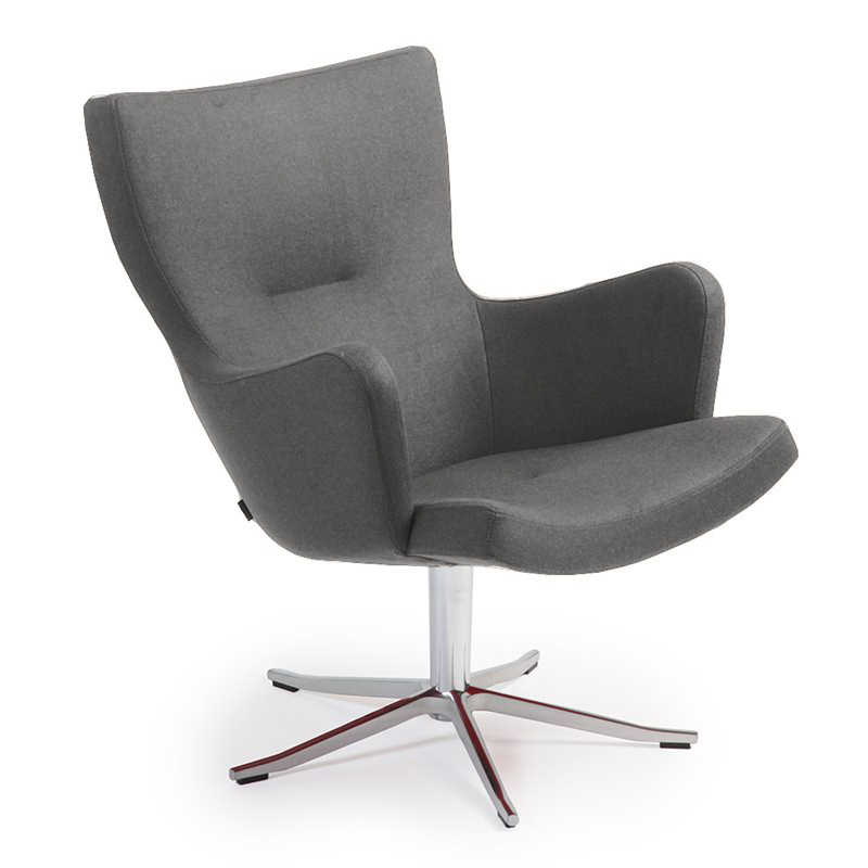 Gyro är en nätt och elegant snurrfåtölj med en bra sittkomfort. Underredet i formgjuten aluminum har ett minne som gör att den alltid stannar på samma ställe. Här med armstöd klädd i tyget Mariam 991345-77, i butiken med snurrfot i svart aluminium. Kan även fås i krom.