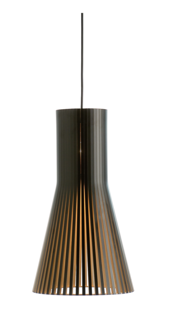 Secto Small 4201 av formgivaren Seppo Koho för finska Secto Design är en taklampa tillverkad av formpressad björk. Träskärmens form och lamellernas mönster skapar en inbjudande, varm och samtidigt spännande ljusbild. Finns i fyra olika utföranden, björk natur, vitt, svart och i valnöt.