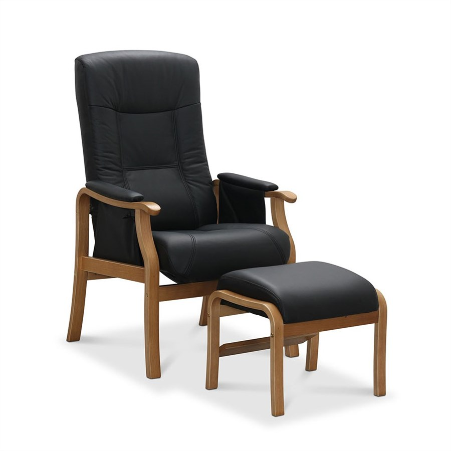Bergen seniorfåtölj med fotpall i ben i ek. Här klädd i svart läder/PU. Fåtöljen har en manuellt justerbar rygg. Denna variant har en elektrisk liftfunktion. Tillhörande fotpall ger skön avlastning för ben och fötter.
