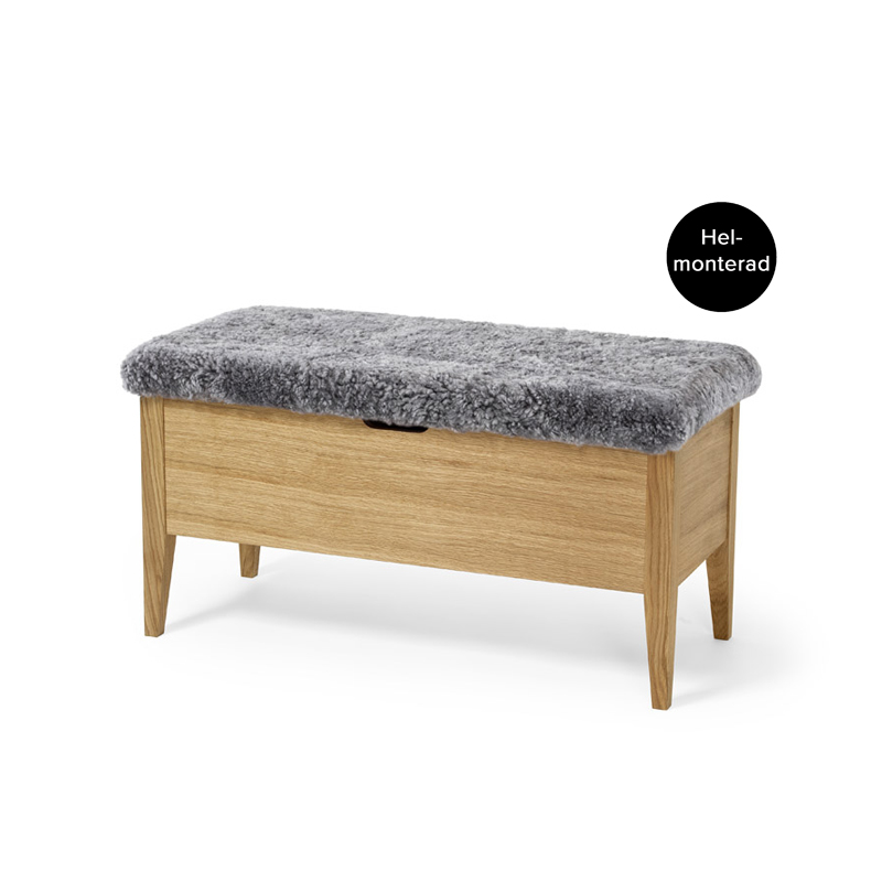 Välj mellan olika klädslar på toppen – grå fårskinnsimitation, äkta fårskinn, ljusgråa tyget Chelsea eller bruna tyget Abriamo. På insidan av bänken finns ett rymligt fack med en praktisk skiljevägg, som även går att tas bort för att göra plats för större föremål.