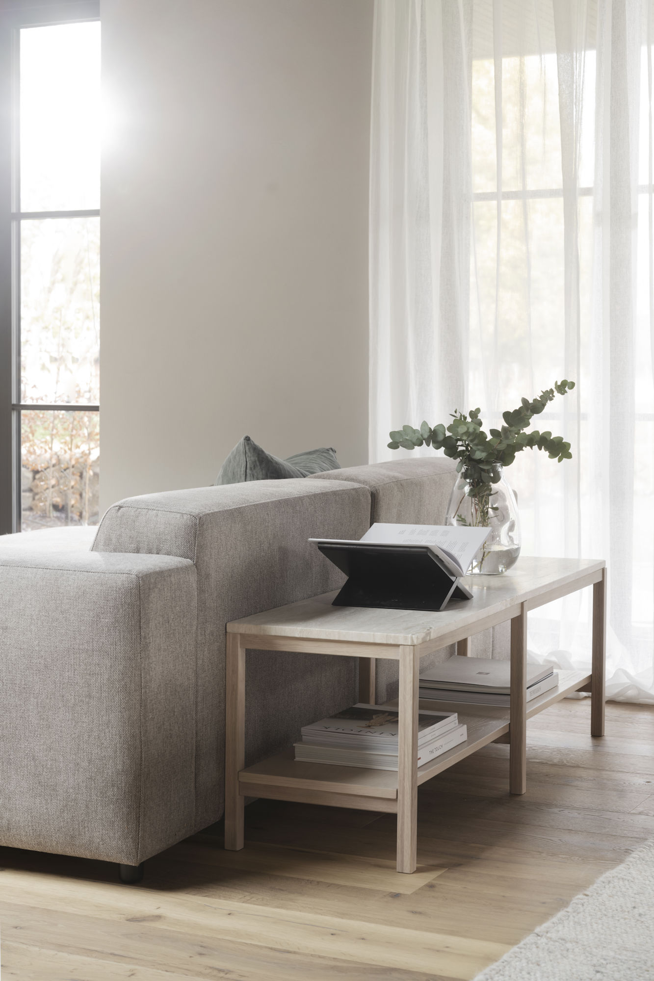 Avlastningsbordet Orwel H45 cm har en exklusiv stenskiva av sandfärgad travertin från Italien som vilar på en stomme av vitpigmenterad FSC-certifierad ek. Travertin är en kalkstenstyp med fina skiftningar som ger avlastningsbordet en naturlig skönhet och med tiden unik patina. Den låga höjden passar perfekt framför ett fönster eller varför inte som tv-bänk? Orwel andas skandinavisk design med det enkla och eleganta formspråket där hållbara material förenas i en vacker helhet. I kollektionen Orwell ingår även avlastningsbord H75 cm samt ett soffbord.