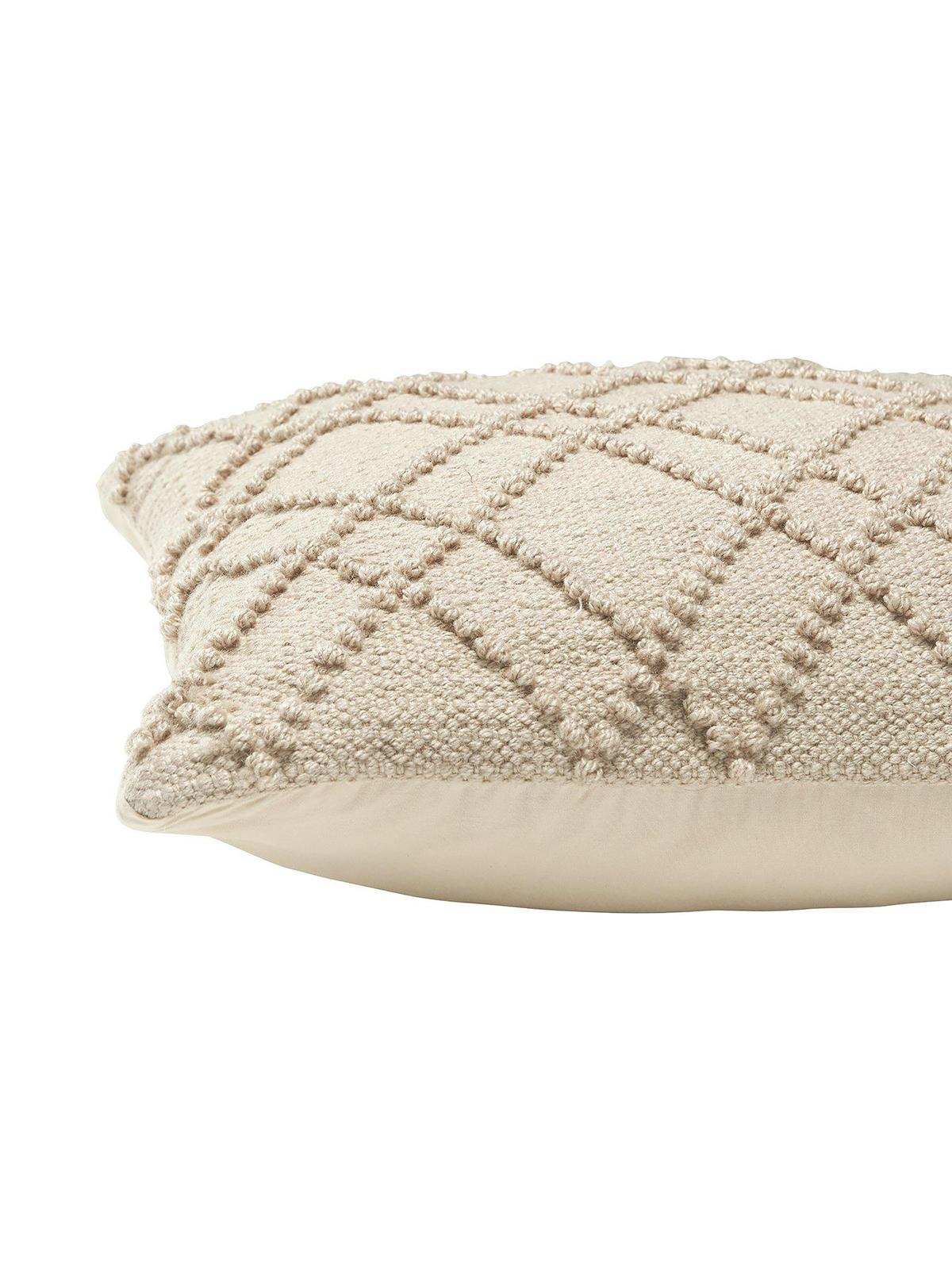 Kuddfodral av återvunnen PET med diskret mönster som går ton i ton med baksidan av bomull. Kuddfodralet är mjukt och även framsidan har en känsla av bomull men är tillverkad av återvunna PET flaskor. Kan användas både inomhus och utomhus. Används kuddfodralet ute tänk på att skydda det för regn.