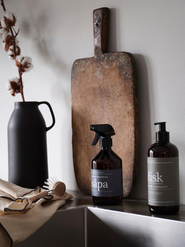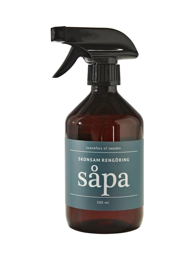"Såpaspray är en effektiv och skonsam allrengöringsspray att använda på alla ytor i hemmet som tål väta, kan med fördel användas på porösa material såsom trägolv, träskivor och altangolv. Baserad på tallolja. Biologiskt nedbrytbar. Mild doft av mandel. Fri från konserveringsmedel.